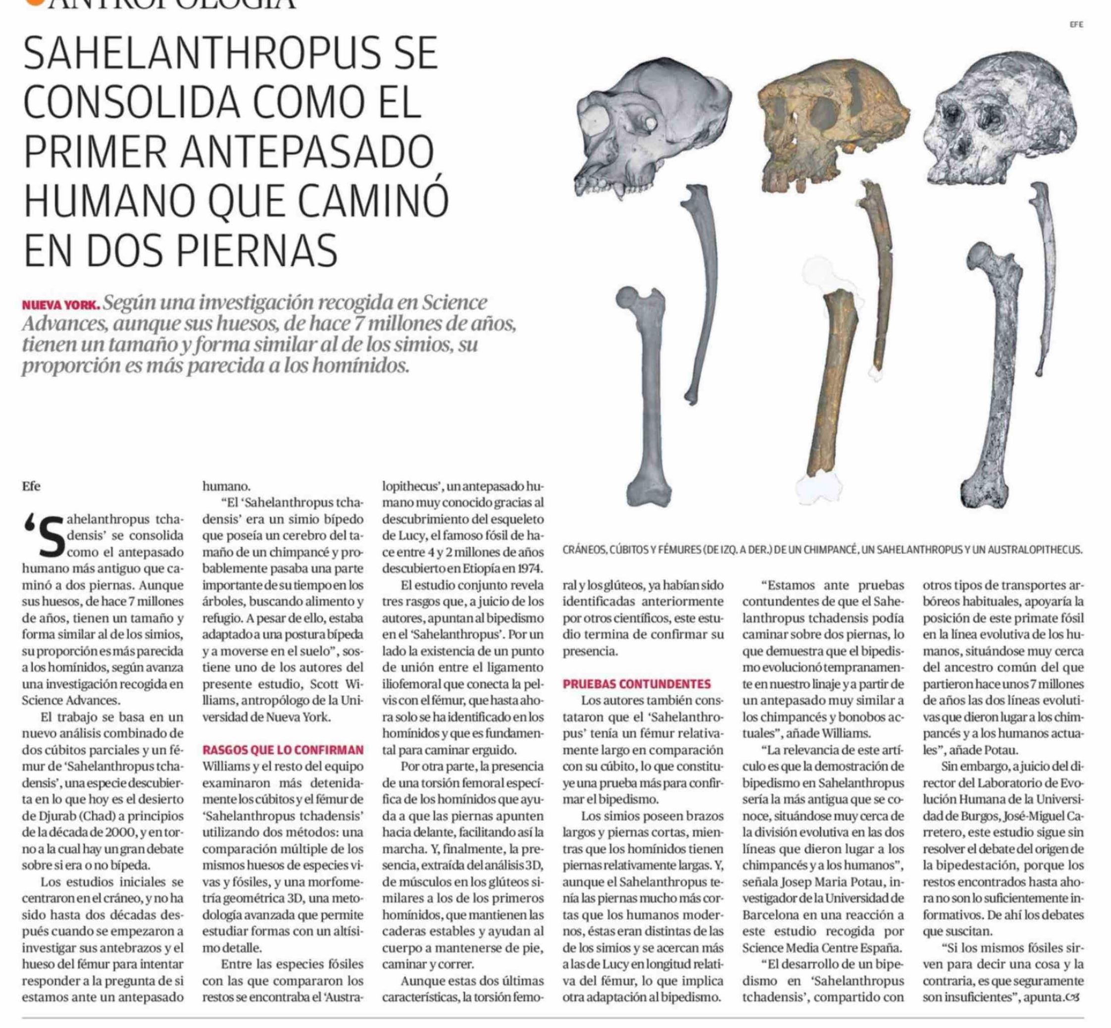 SAHELANTHROPUS SE CONSOLIDA COMO EL PRIMER ANTEPASADO HUMANO QUE CAMINÓ EN DOS PIERNAS