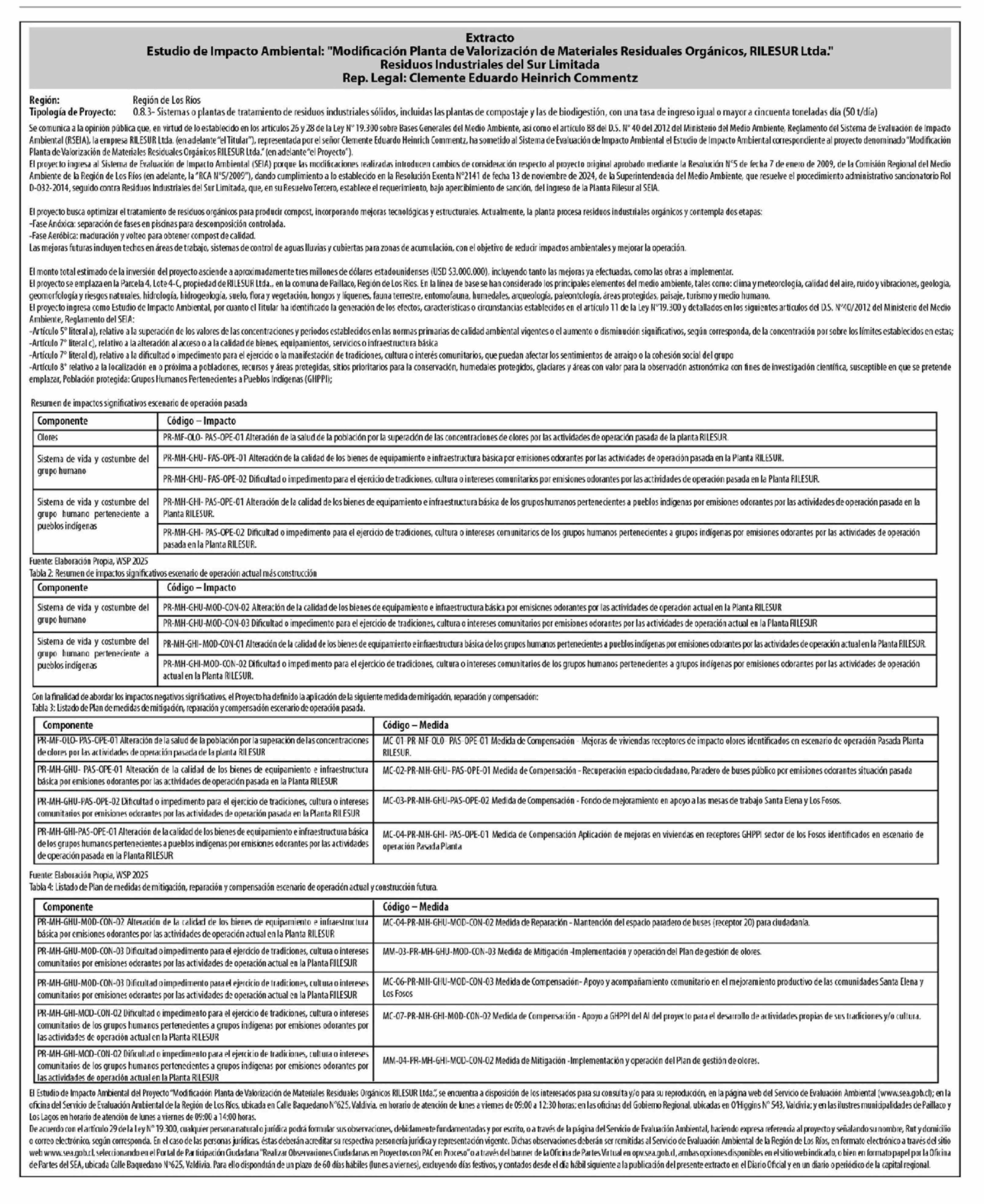 Título: Extractos: Extracto Estudio de Impacto Ambiental: "Modificación Planta de Valorización de Materiales Residuales Orgánicos, RILESUR Ltda." Residuos Industriales del Sur Limitada Rep. Legal: Clemente Eduardo Heinrich Commentz Región de Los Ríos 0.8.3- Sistemas o plantas de tratamiento de residuos indu