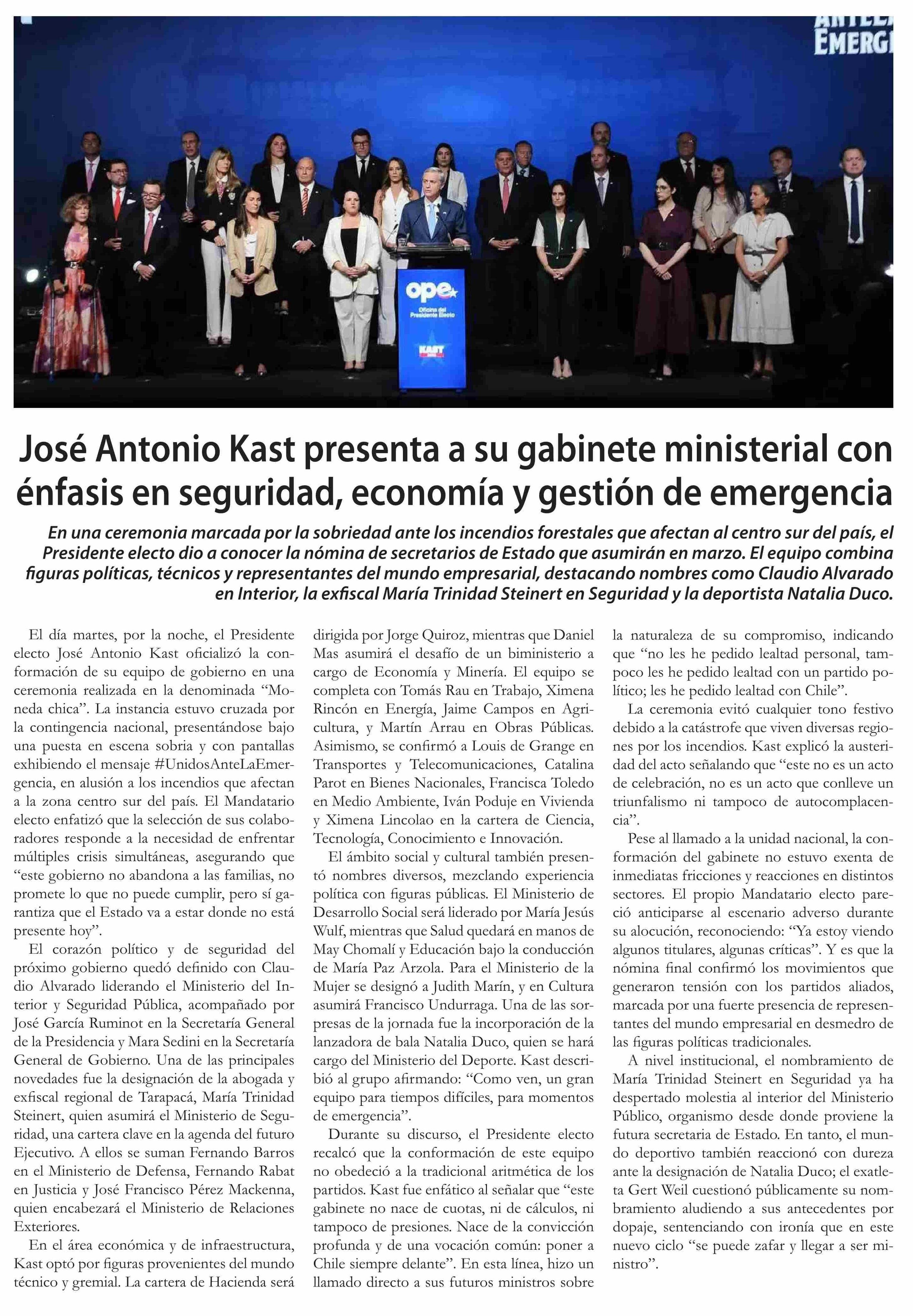 José Antonio Kast presenta a su gabinete ministerial con énfasis en seguridad, economía y gestión de emergencia