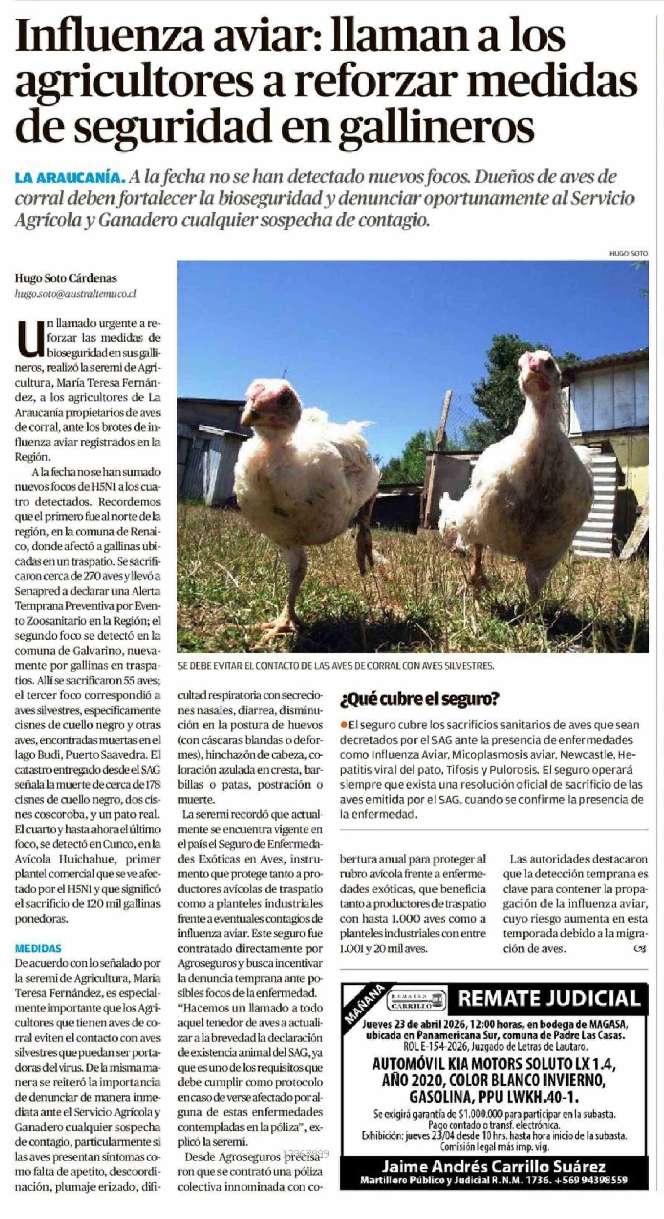 Influenza aviar: llaman a los agricultores a reforzar medidas de seguridad en gallineros