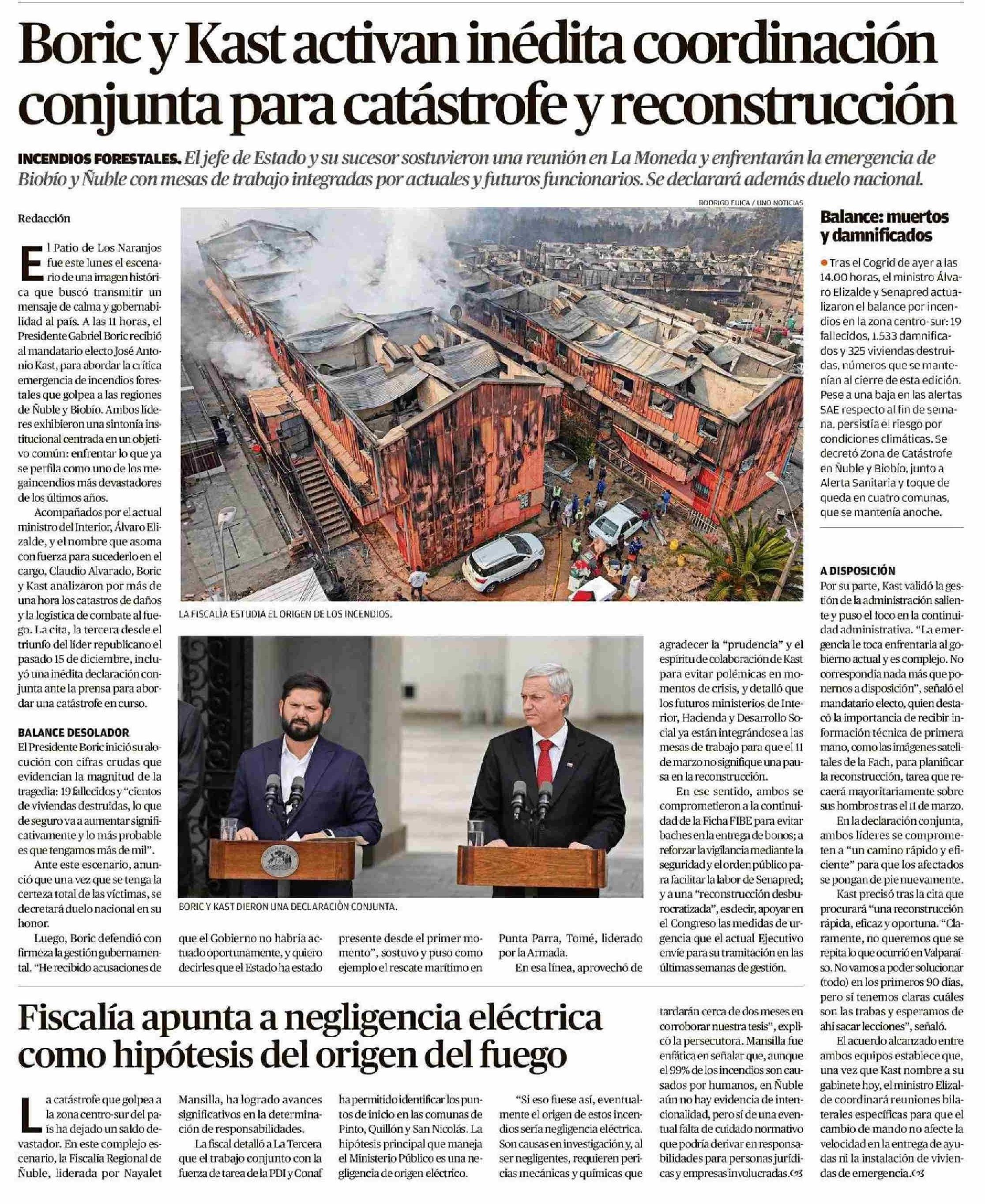 Boric y Kast activan inédita coordinación conjunta para catástrofe y reconstrucción