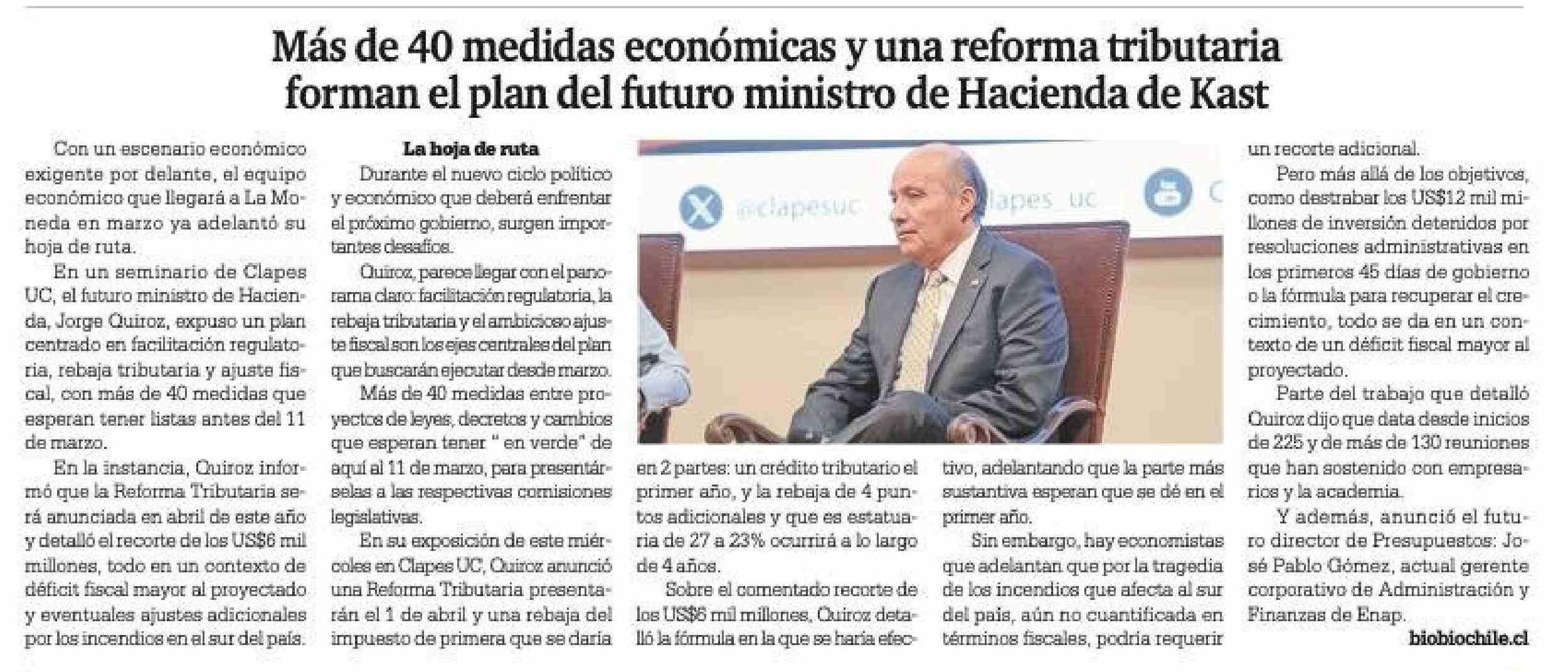 Título: Más de 40 medidas económicas y una reforma tributaria forman el plan del futuro ministro de Hacienda de Kast