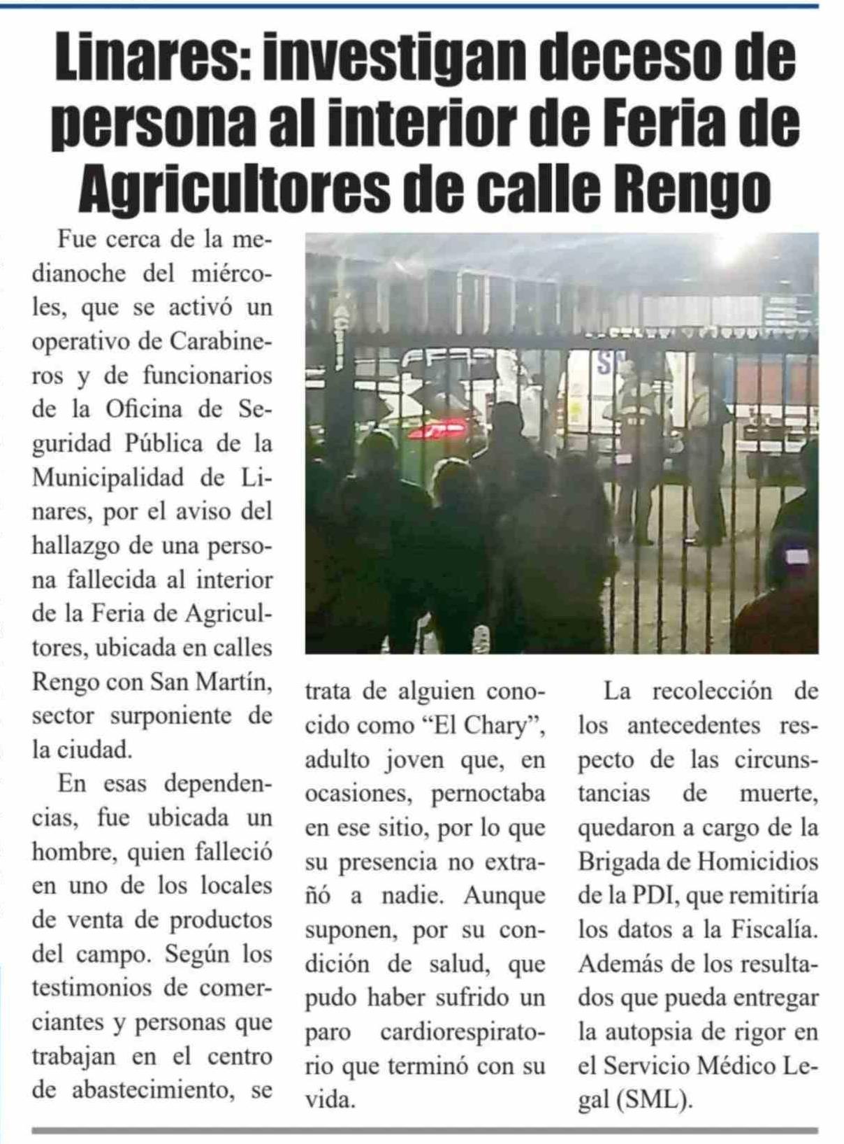 Linares: investigan deceso de persona al interior de Feria de Agricultores de calle Rengo