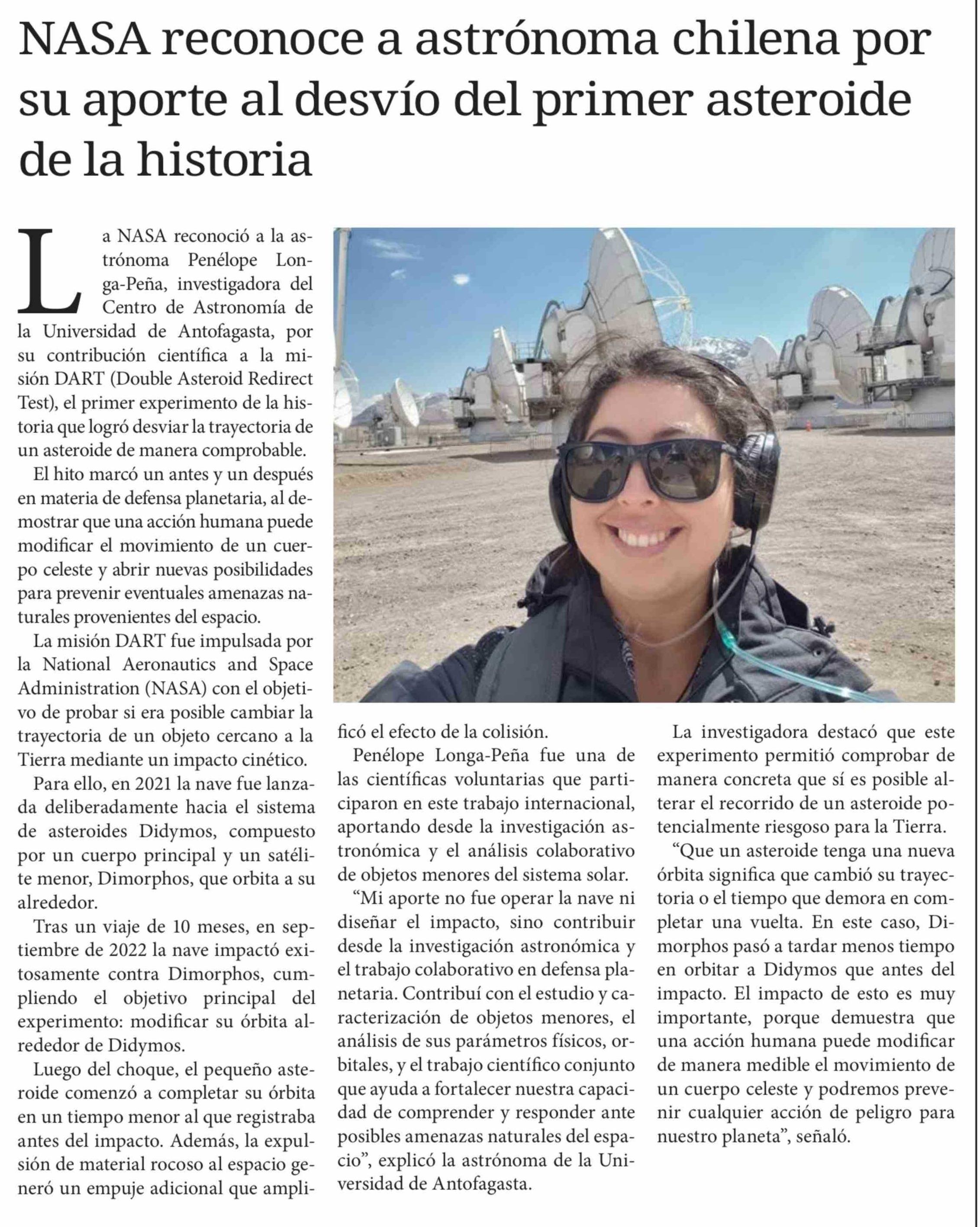 NASA reconoce a astrónoma chilena por su aporte al desvío del primer asteroide de la historia