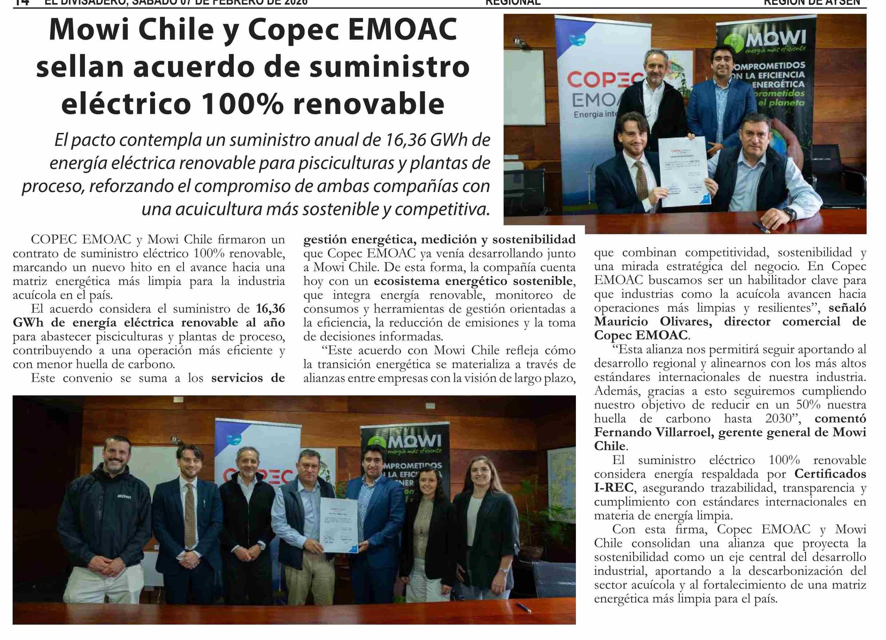 Mowi Chile y Copec EMOAC sellan acuerdo de suministro eléctrico 100% renovable