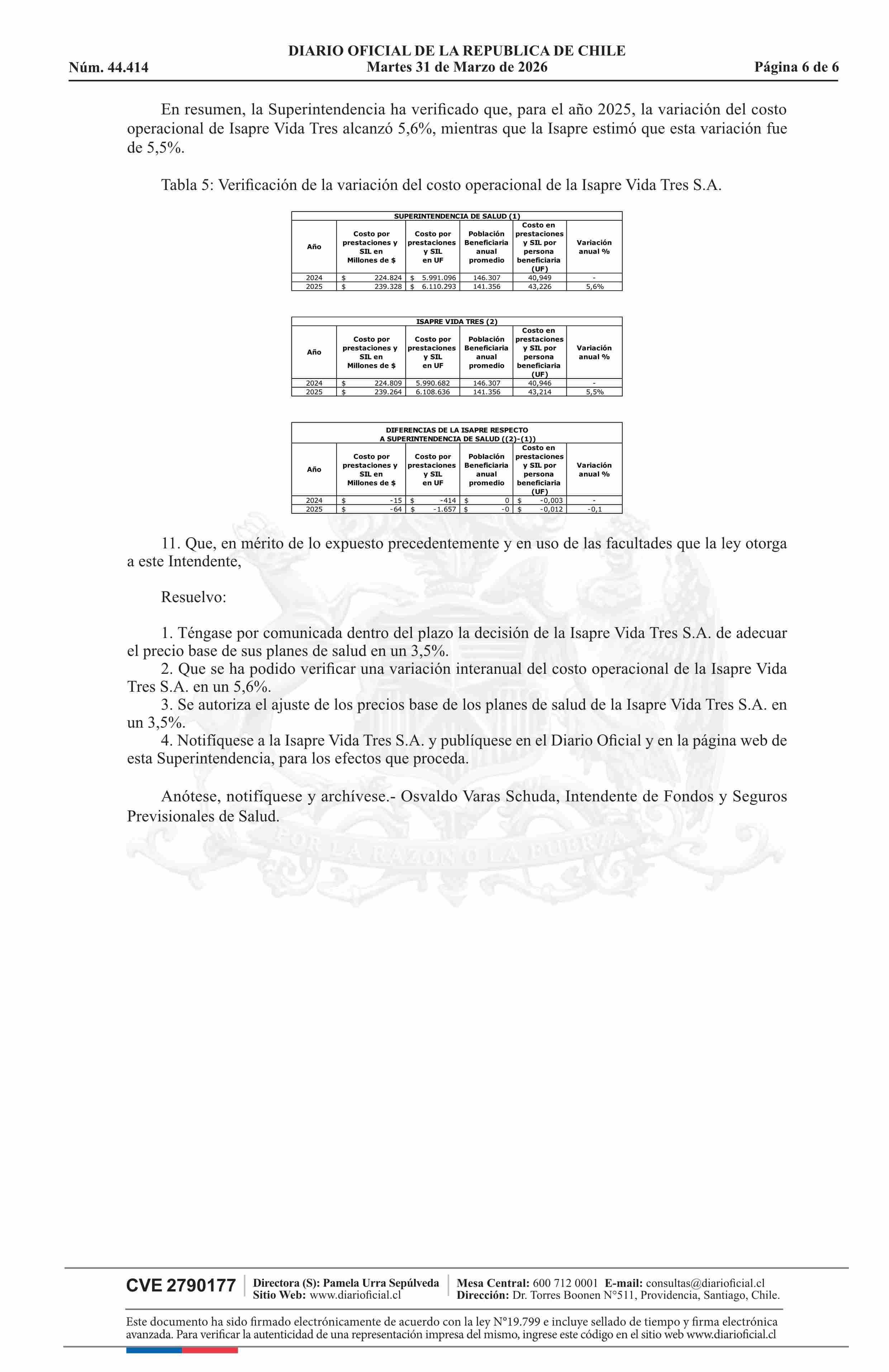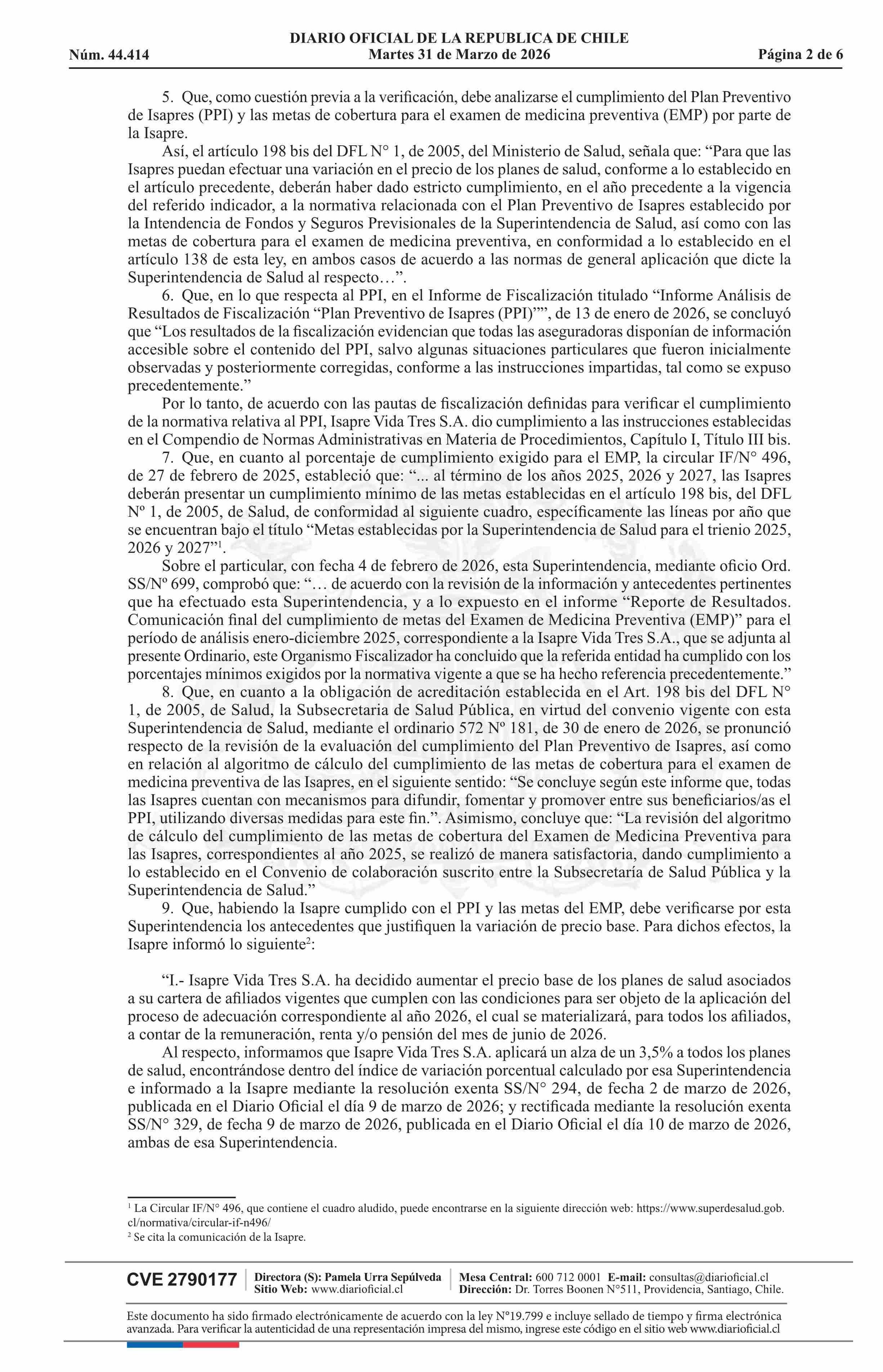 | Título: | Superintendencia de Salud / Intendencia de Fondos y Seguros Previsionales de Salud AUTORIZA ELAJUSTE DE LOS PRECIOS BASE DE LOS PLANES DE SALUD DE LA ISAPRE VIDA TRES S.A. |