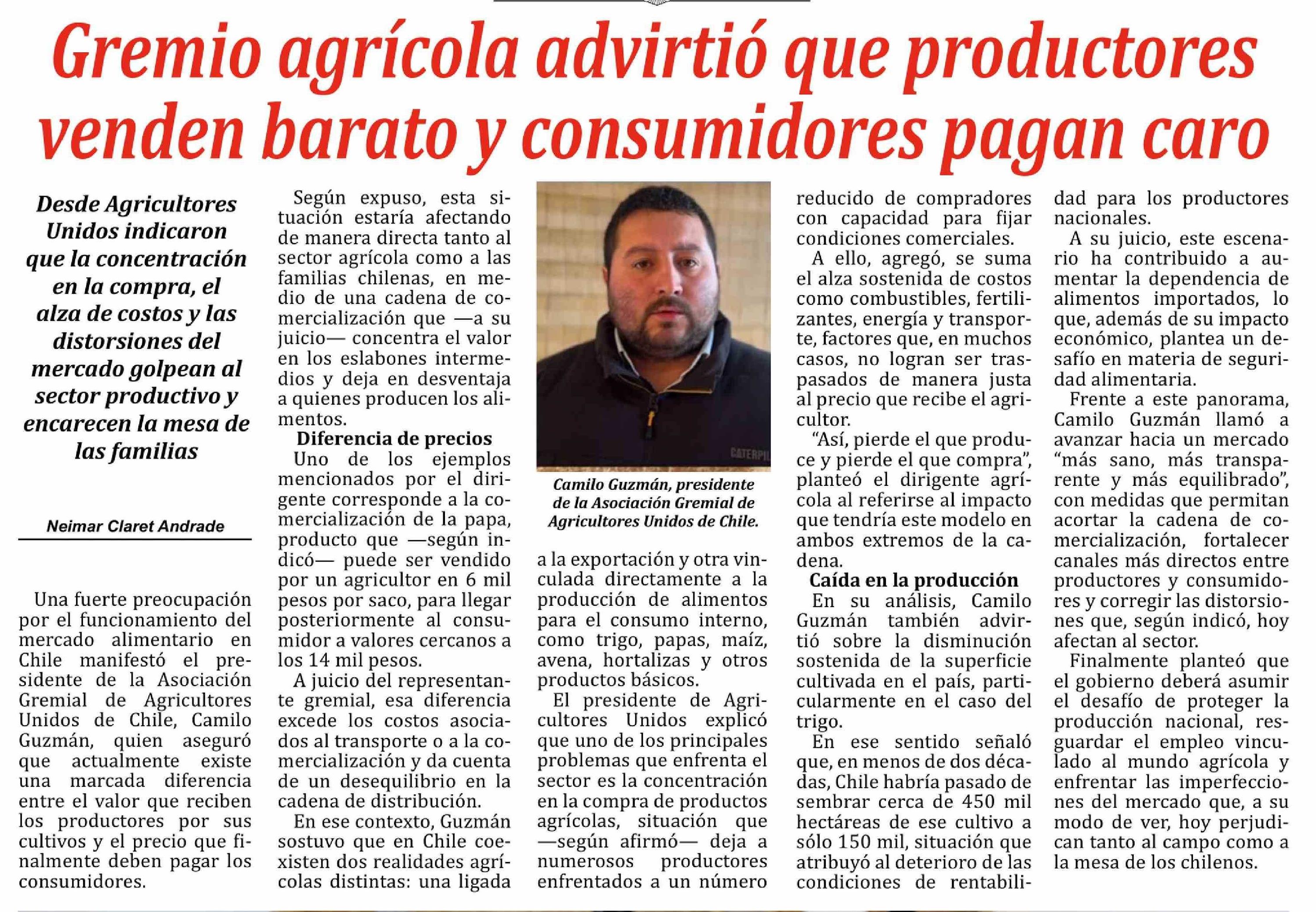 Gremio agrícola advirtió que productores venden barato y consumidores pagan caro