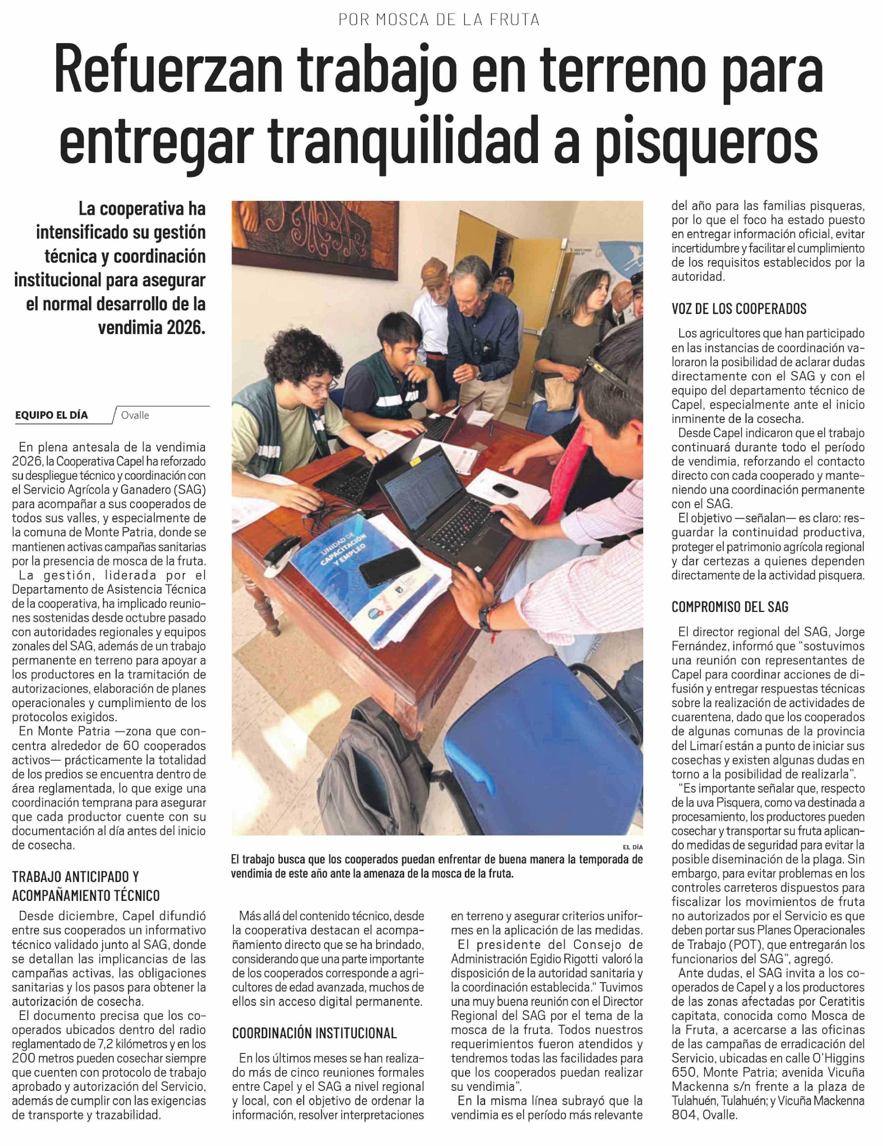 Refuerzan trabajo en terreno para entregar tranquilidad a pisqueros