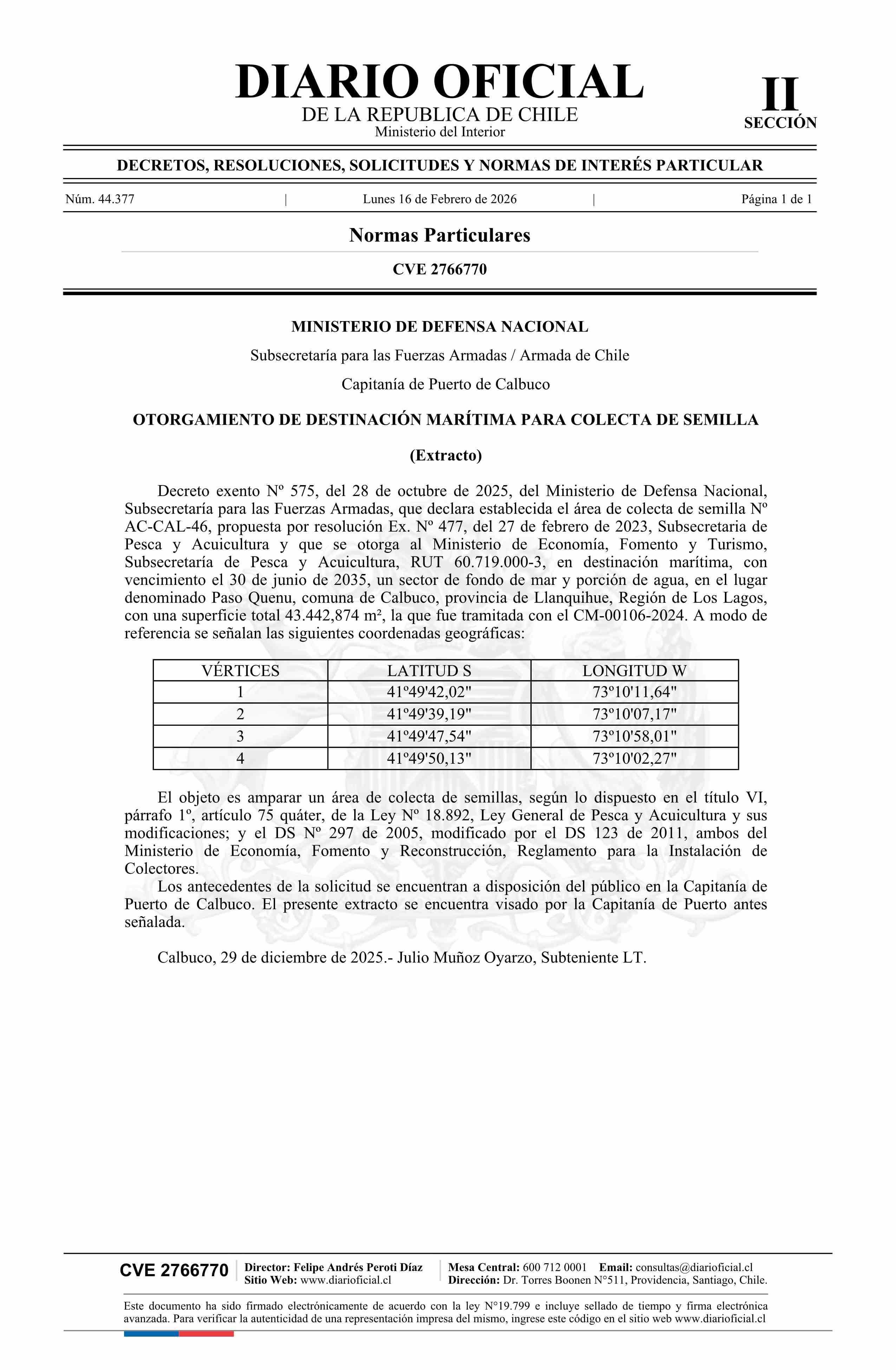 | Título: | Extracto de decreto exento número 575, de 2025.- Otorgamiento de destinación marítima para colecta de semilla |