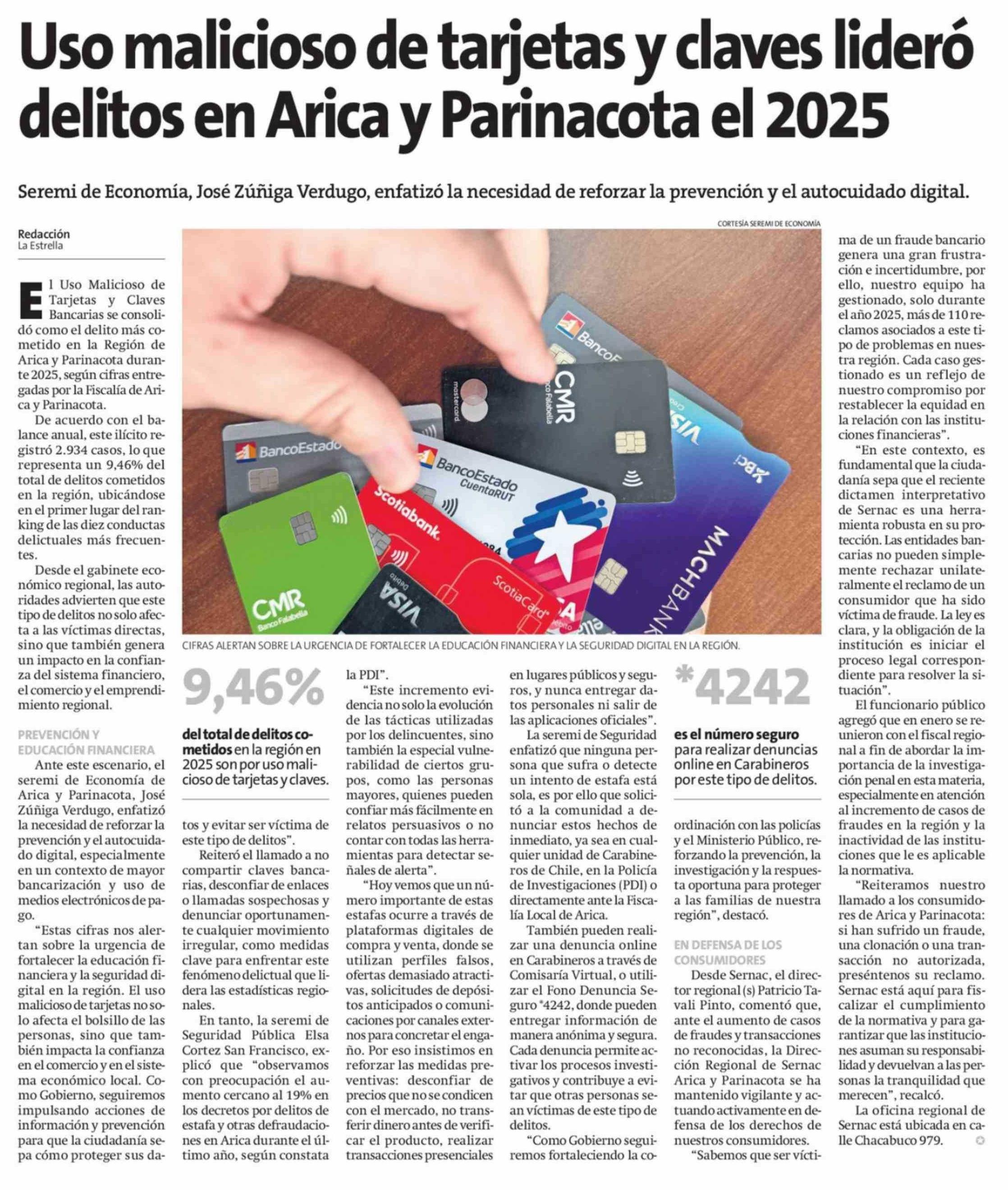 Uso malicioso de tarjetas y claves lideró delitos en Arica y Parinacota el 2025