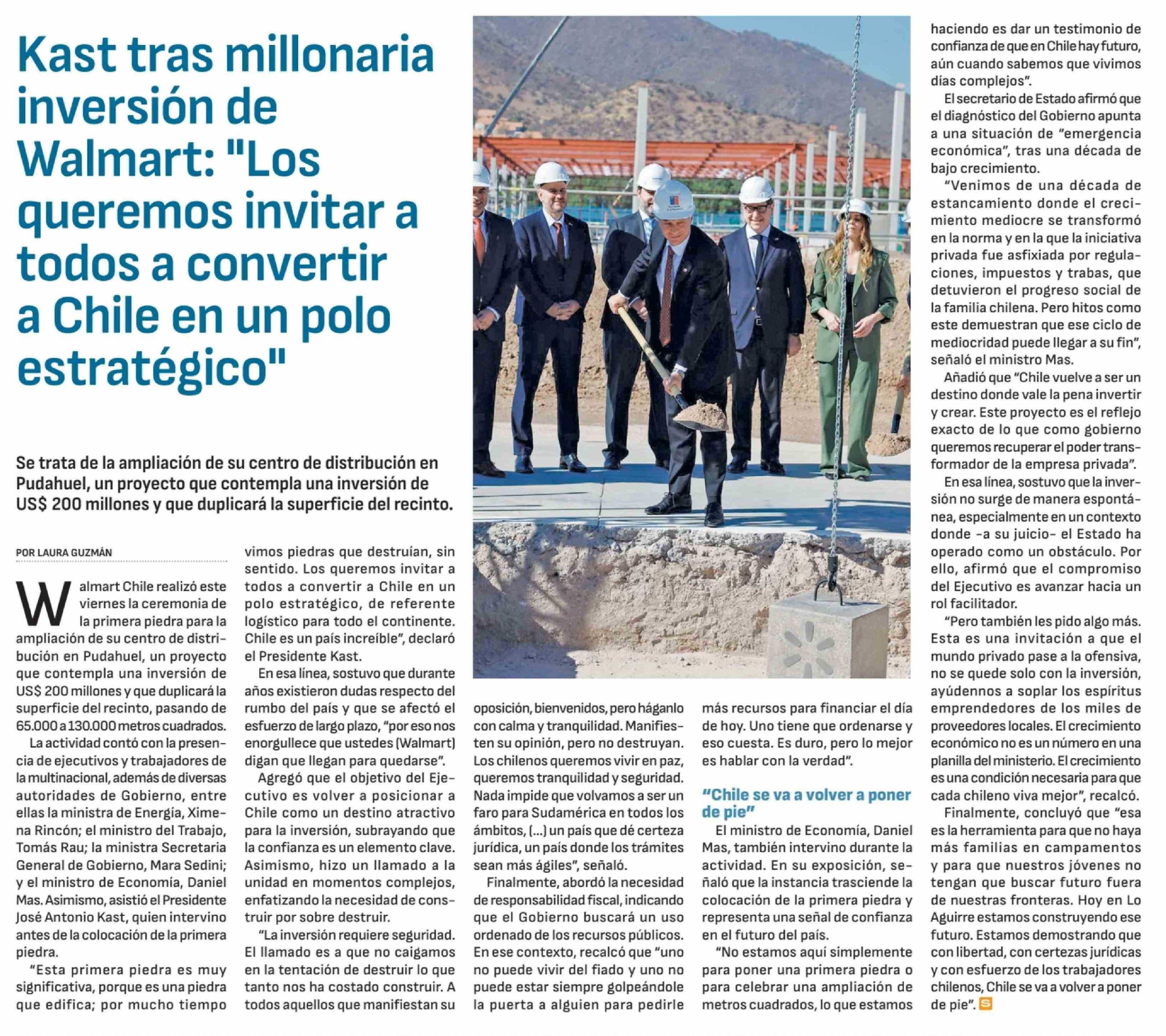 | Título: | Kast tras millonaria inversión de Walmart: "Los queremos invitar a todos a convertir a Chile en un polo estratégico" |
