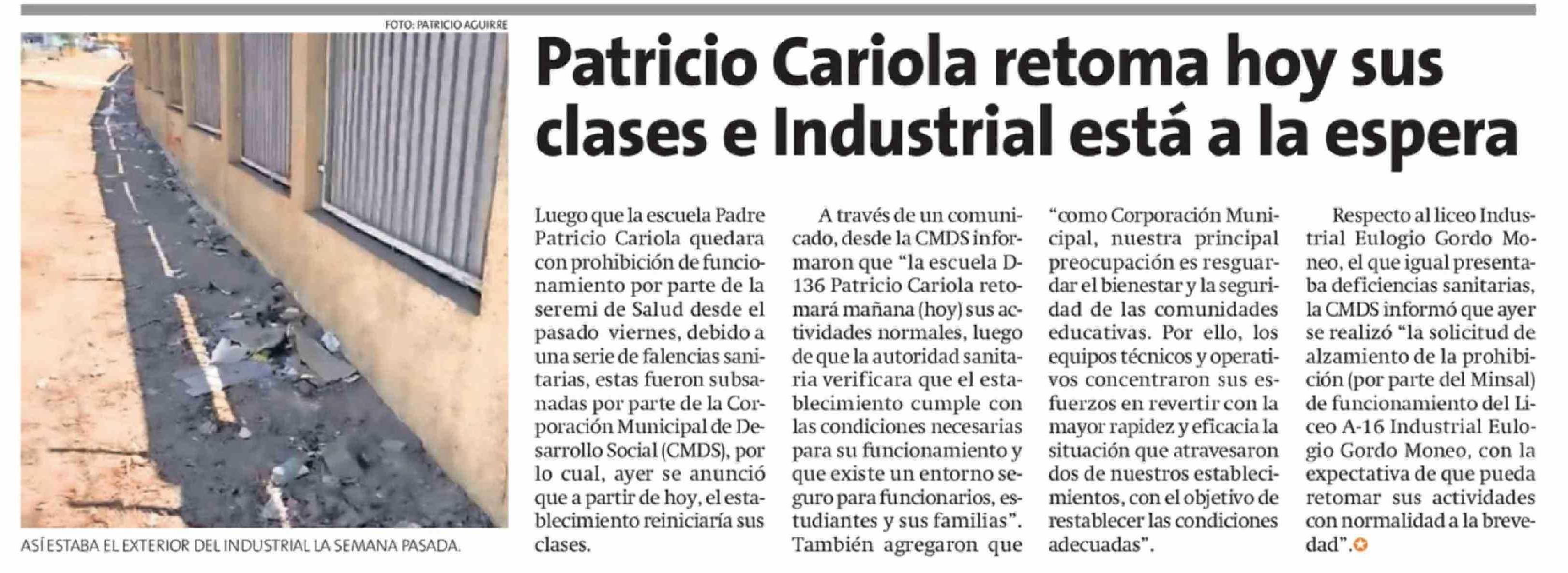 Patricio Cariola retoma hoy sus clases e Industrial está a la espera