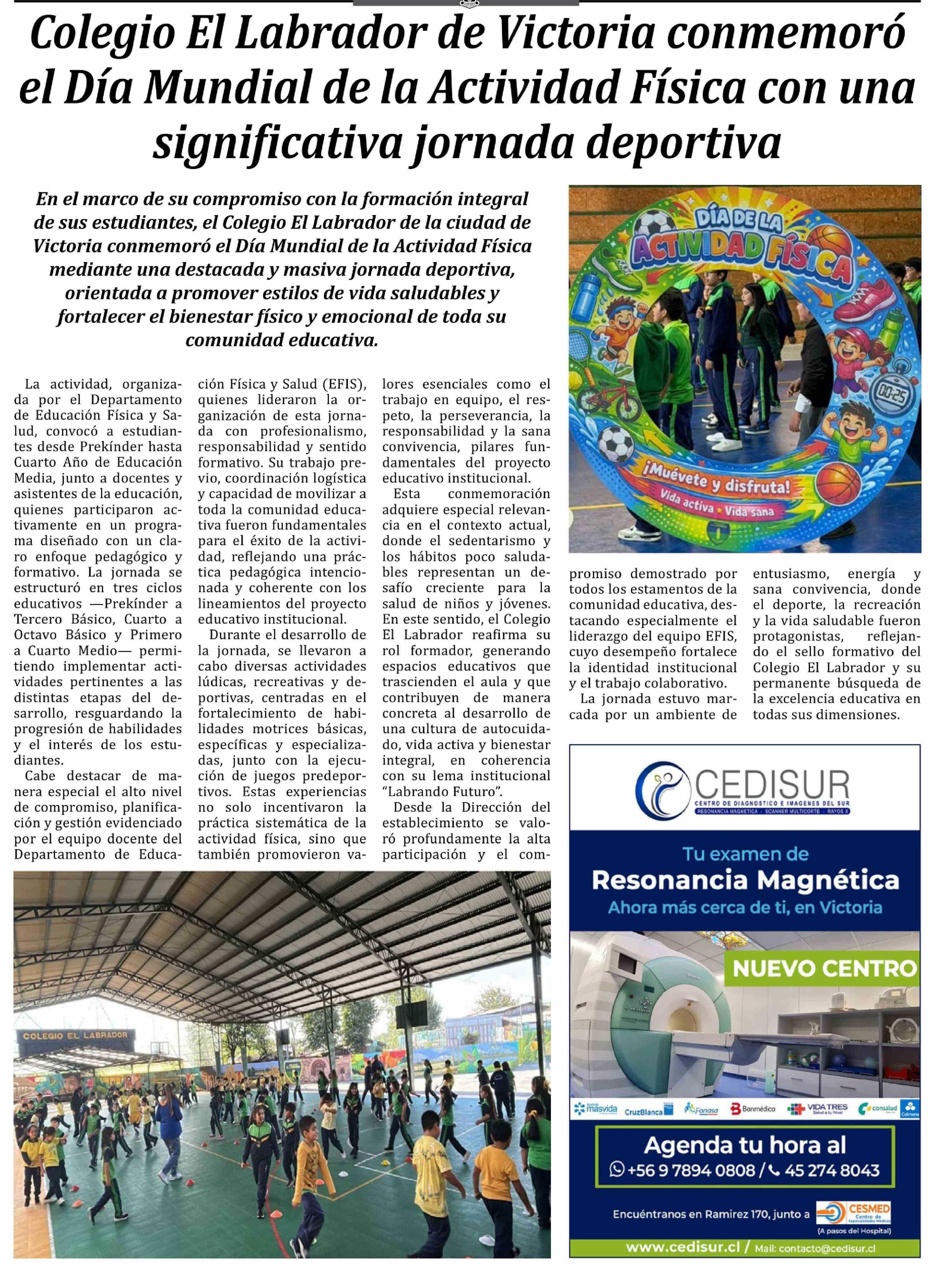 Colegio El Labrador de Victoria conmemoró el Día Mundial de la Actividad Física con una significativa jornada deportiva