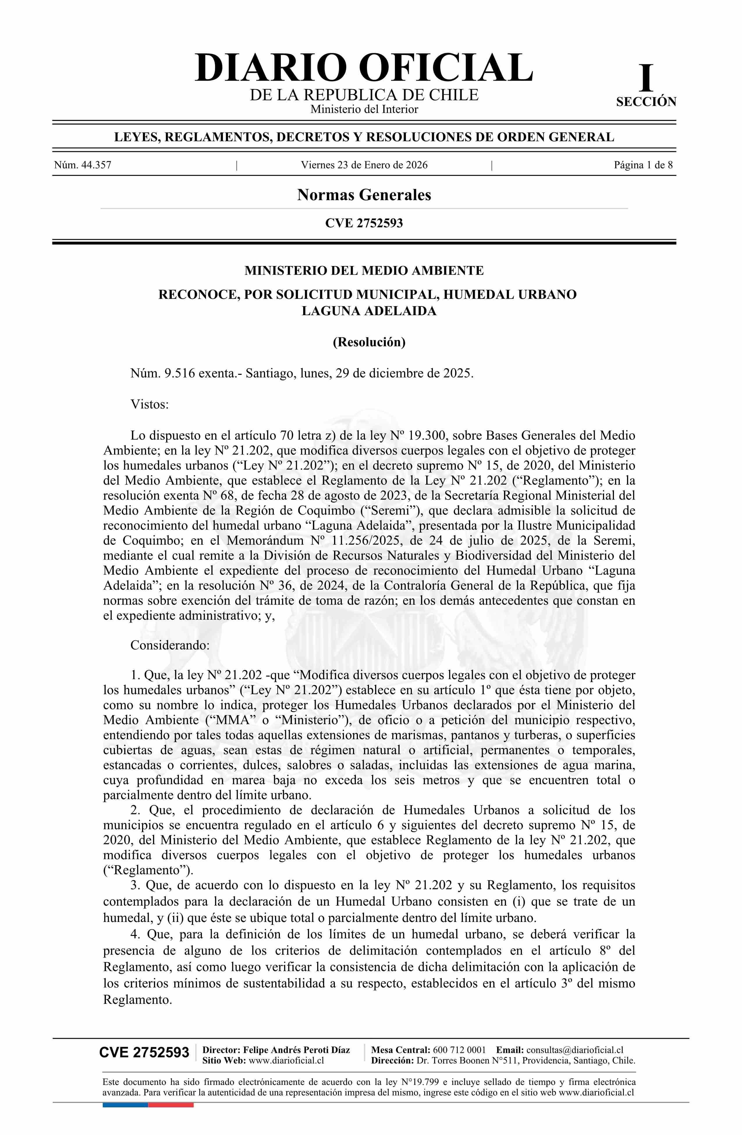 | Título: | Resolución exenta número 9.516, de 2025.- Reconoce, por solicitud municipal, humedal urbano Laguna Adelaida |