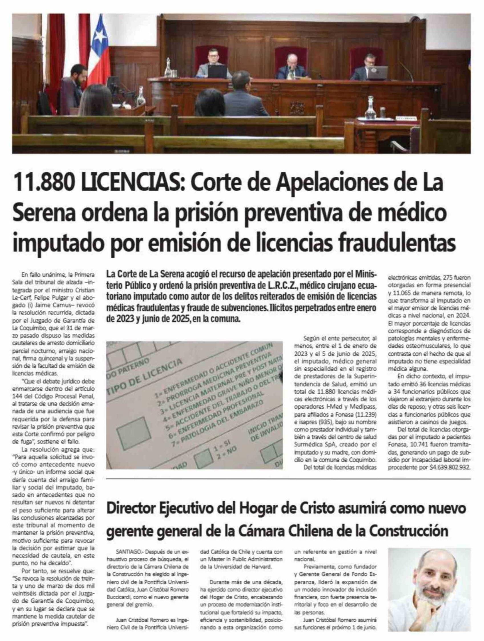 11.880 LICENCIAS: Corte de Apelaciones de La Serena ordena la prisión preventiva de médico imputado por emisión de licencias fraudulentas