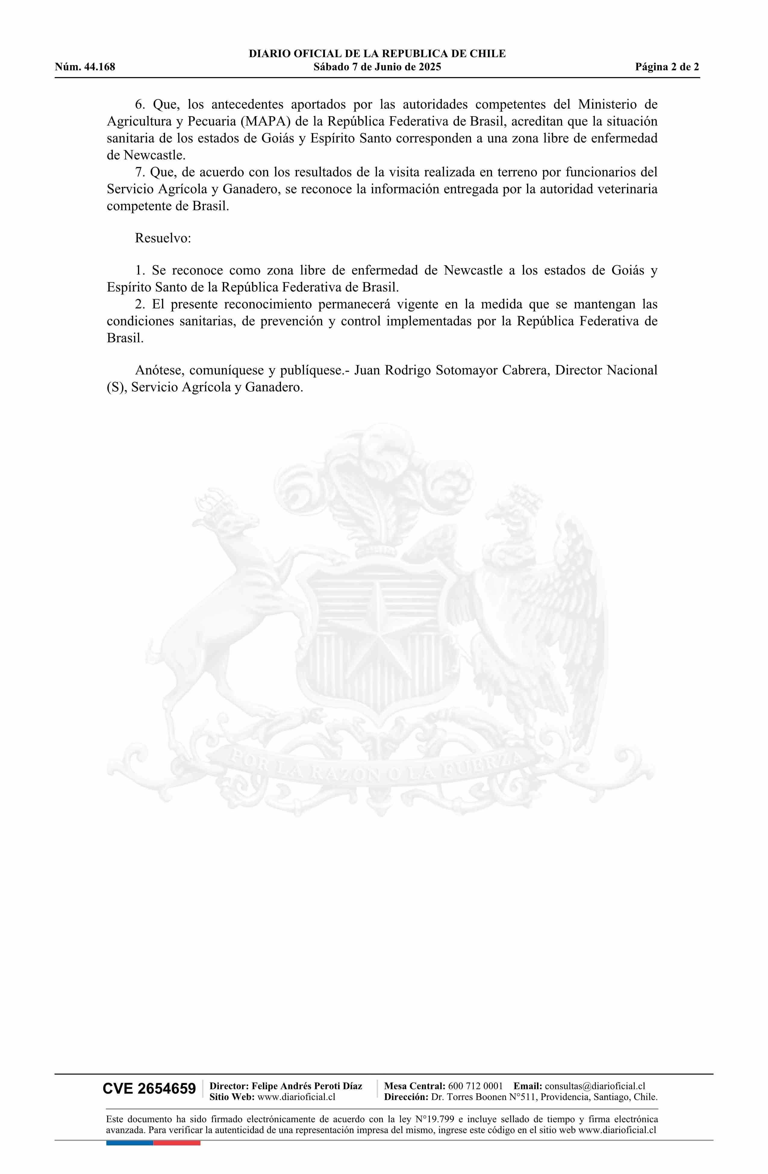 | Título: | Resolución exenta número 3.818, de 2025.- Reconoce como zona libre de enfermedad de Newcastle a los Estados de Goiás y Espírito Santo de la República Federativa de Brasil |