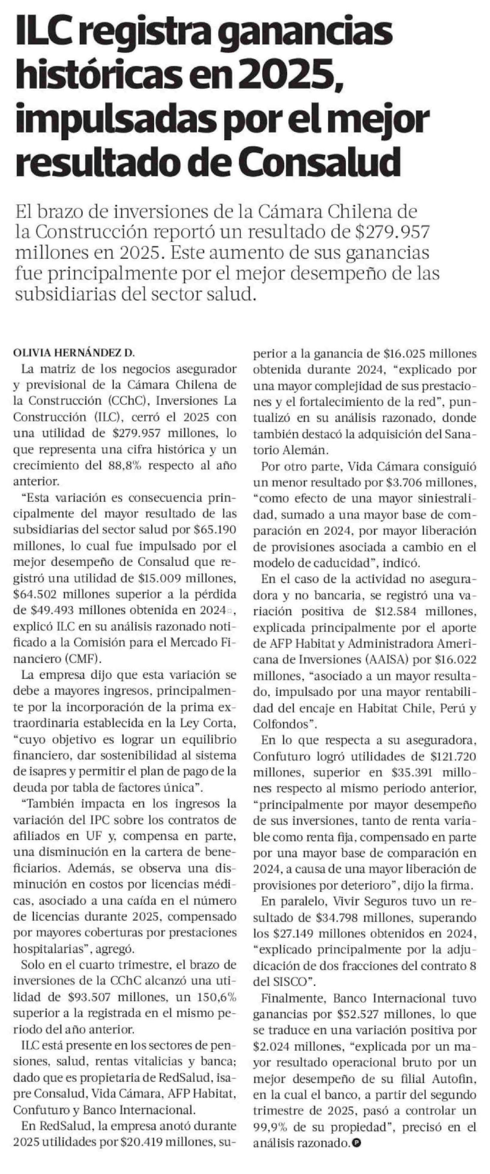 ILC registra ganancias históricas en 2025, impulsadas por el mejor resultado de Consalud