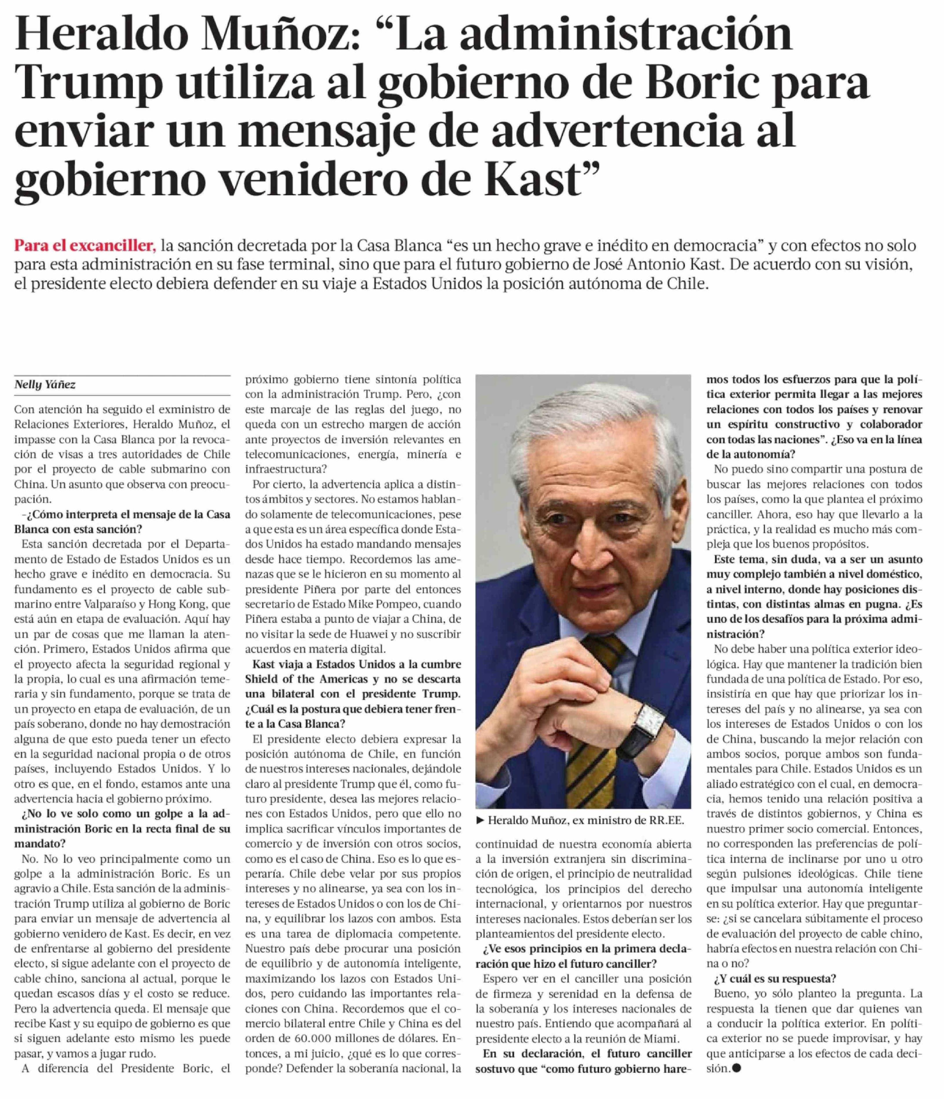Heraldo Muñoz: "La administración Trump utiliza al gobierno de Boric para enviar un mensaje de advertencia al gobierno venidero de Kast"