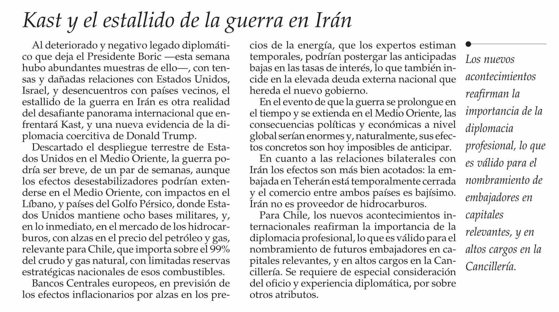 Título: EDITORIAL: Kast y el estallido de la guerra en Irán