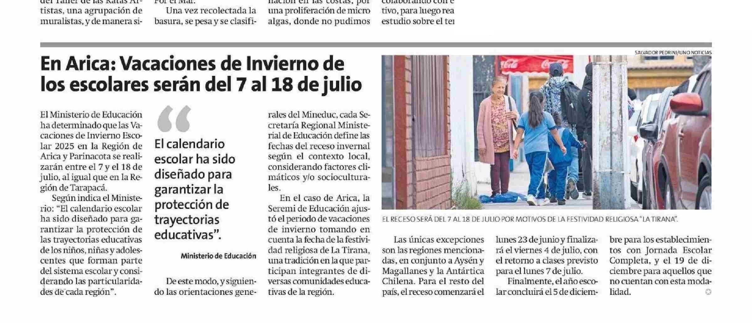 En Arica: Vacaciones de Invierno de los escolares serán del 7 al 18 de julio