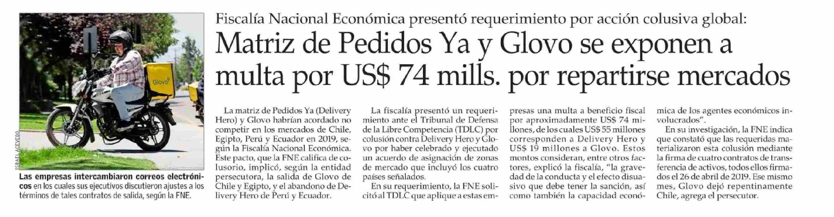 Matriz de Pedidos Ya y Glovo se exponen a multa por US$ 74 mills. por repartirse mercados