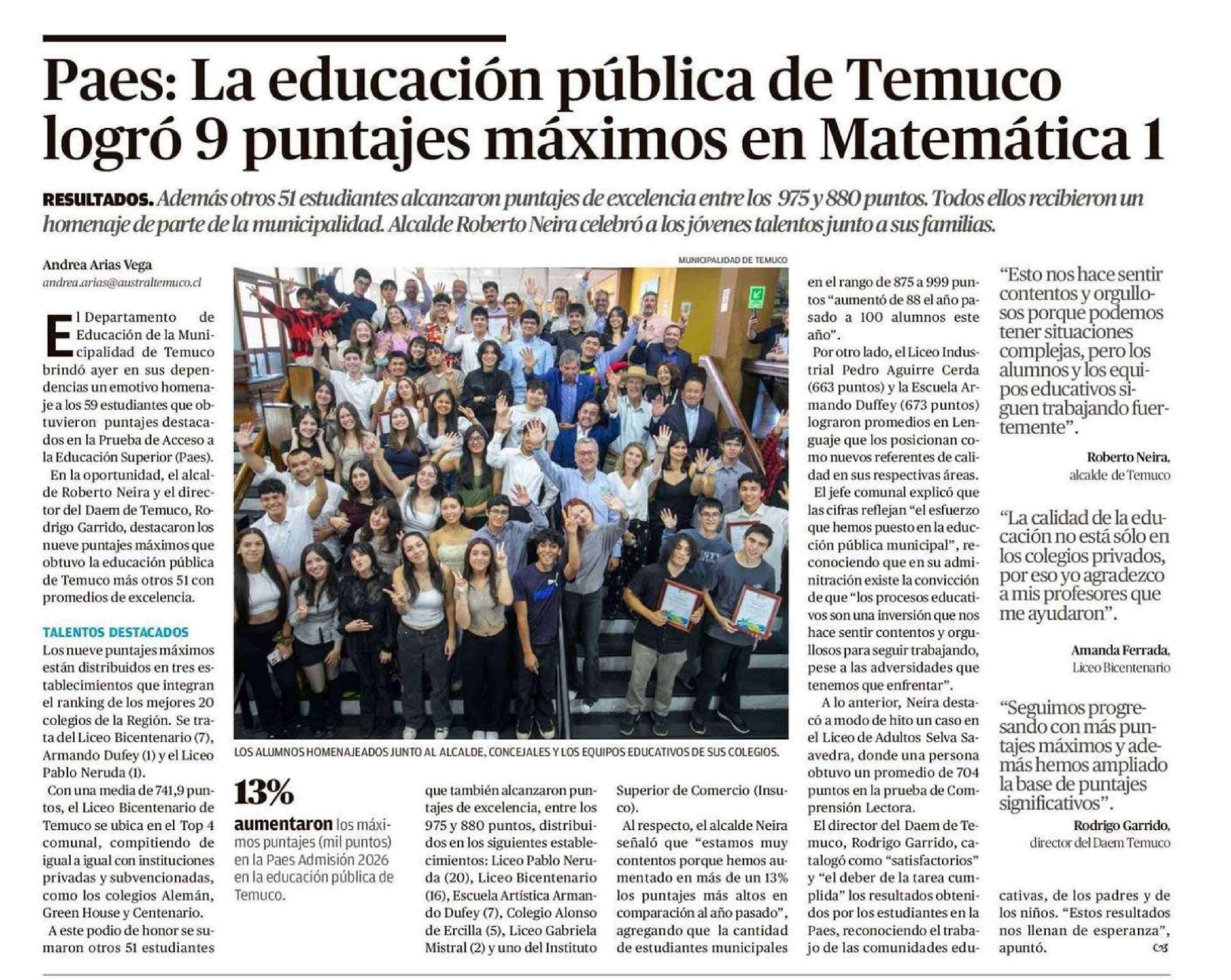 Paes: La educación pública de Temuco logró 9 puntajes máximos en Matemática 1