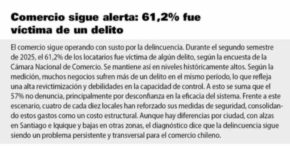 Título: Comercio sigue alerta: 61,2% fue víctima de un delito El comercio sigue operando con susto por la delincuencia. Durante el segundo semestre de 2025, el 61,2% de los locatarios fue víctima de algún delito, según la encuesta de la Cámara Nacional de Comercio. Se mantiene así en niveles históricamente