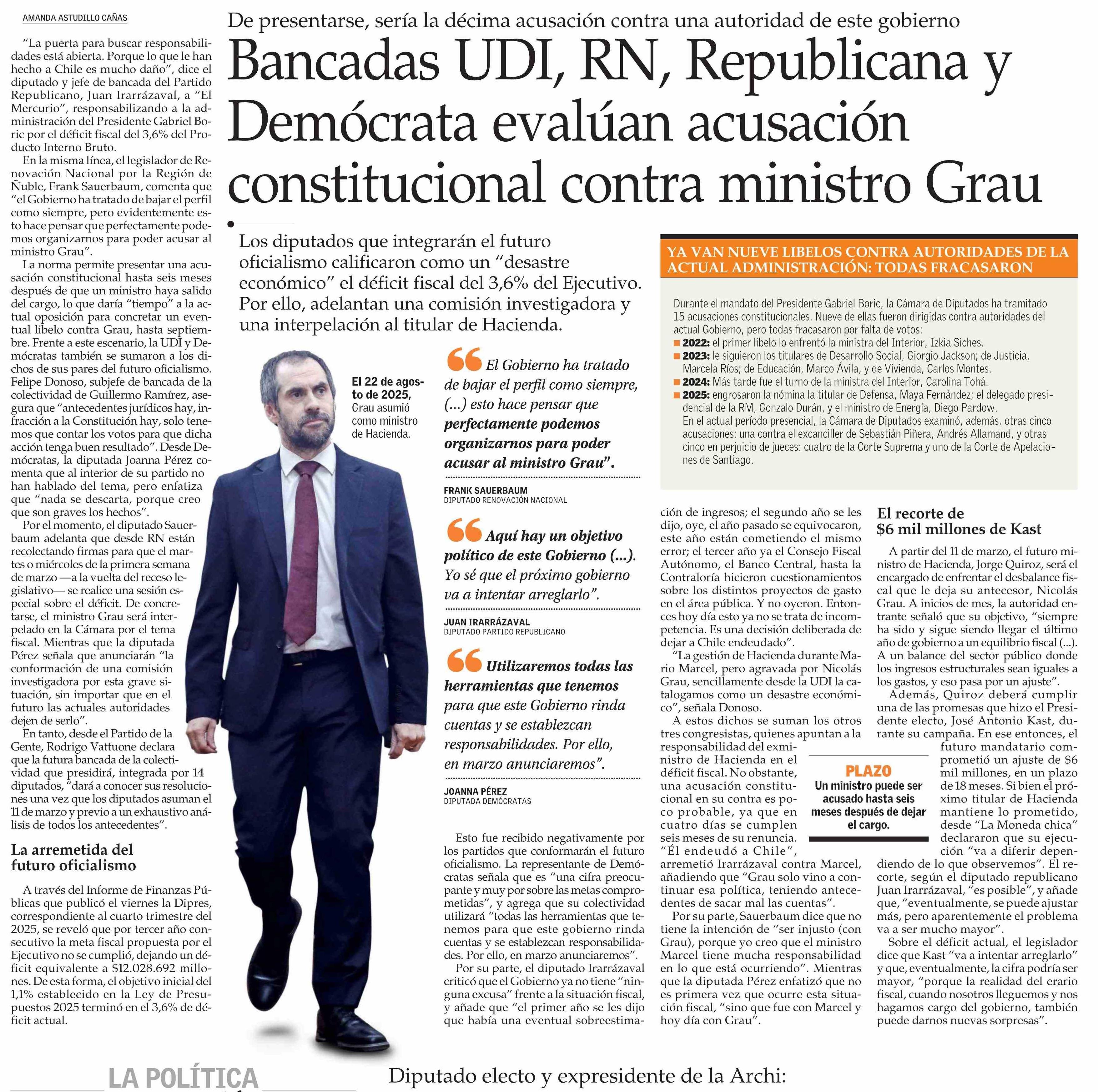 Bancadas UDI, RN, Republicana y Demócrata evalúan acusación constitucional contra ministro Grau