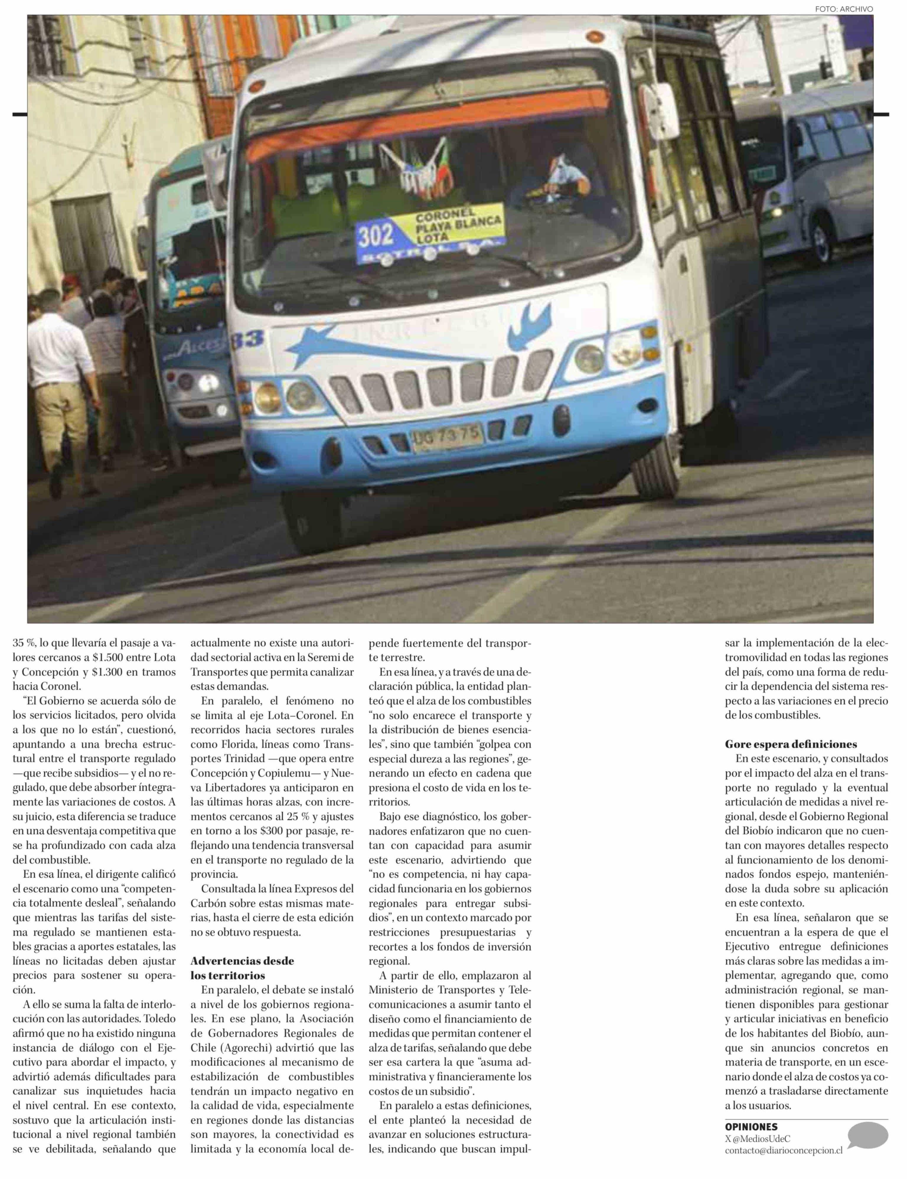 Incremento del diésel presiona tarifas de transporte no licitado en Lota y Coronel con aumentos de hasta 35%