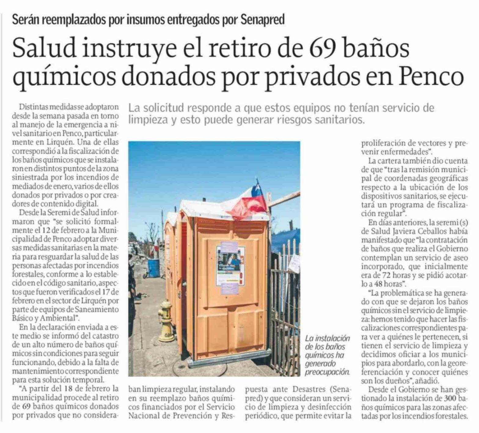 Título: Salud instruye el retiro de 69 baños químicos donados por privados en Penco