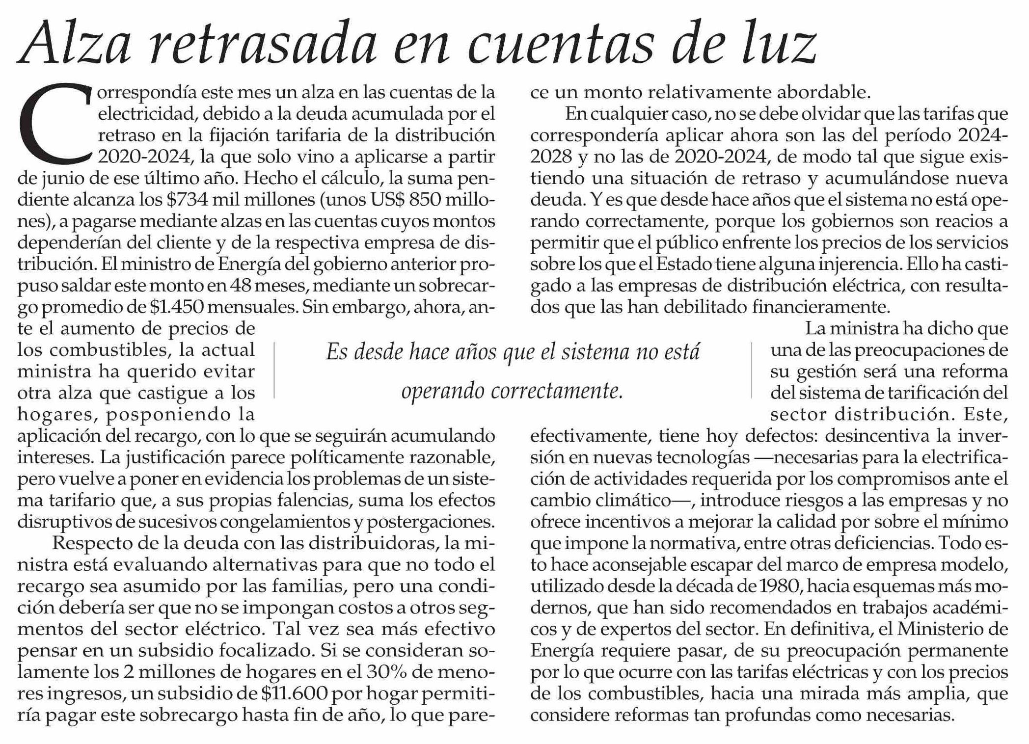 Editorial: Alza retrasada en cuentas de luz