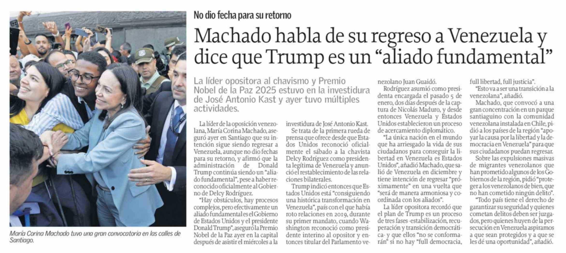 Machado habla de su regreso a Venezuela y dice que Trump es un "aliado fundamental"