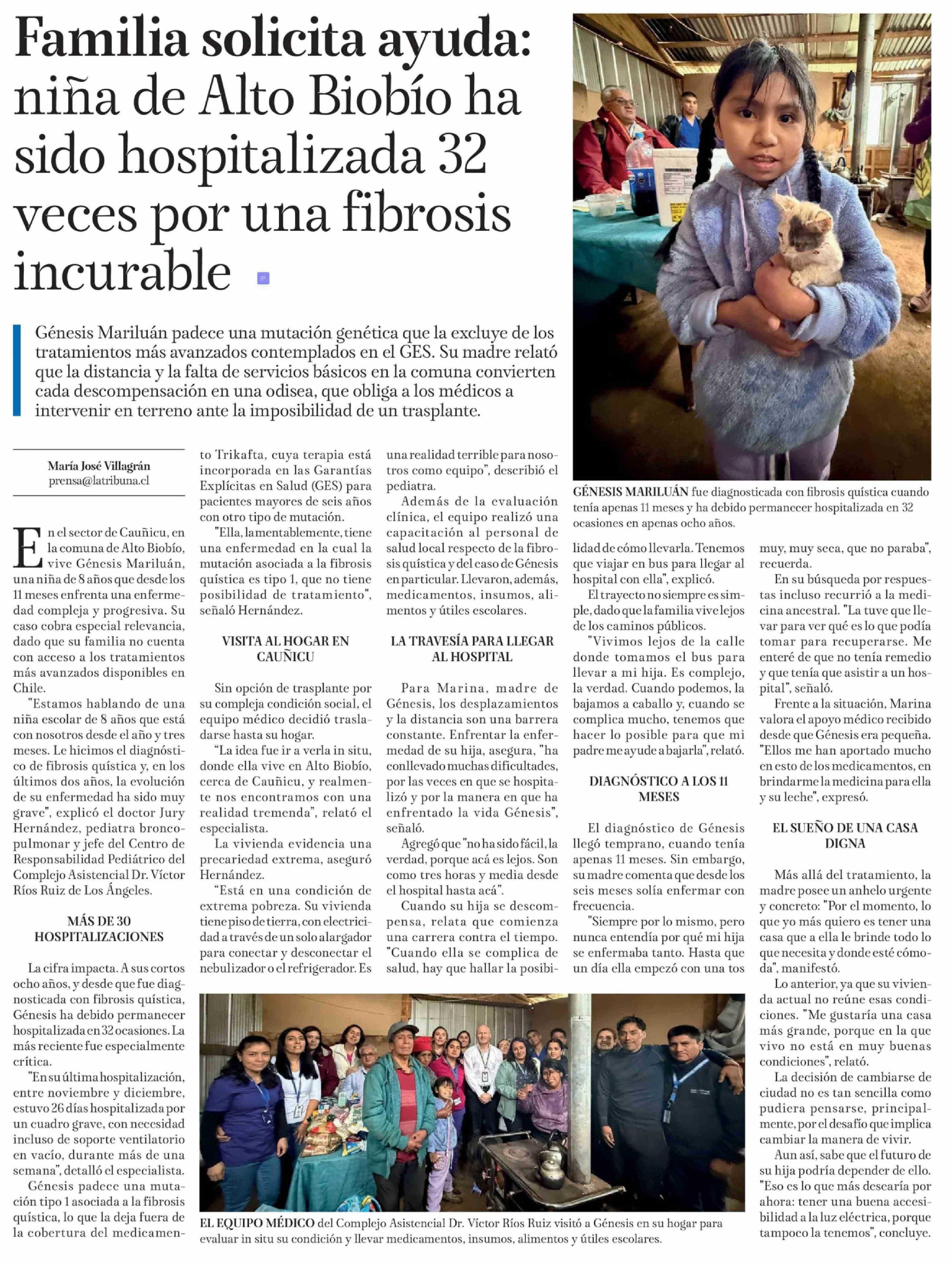 Familia solicita ayuda: niña de Alto Biobío ha sido hospitalizada 32 veces por una fibrosis incurable