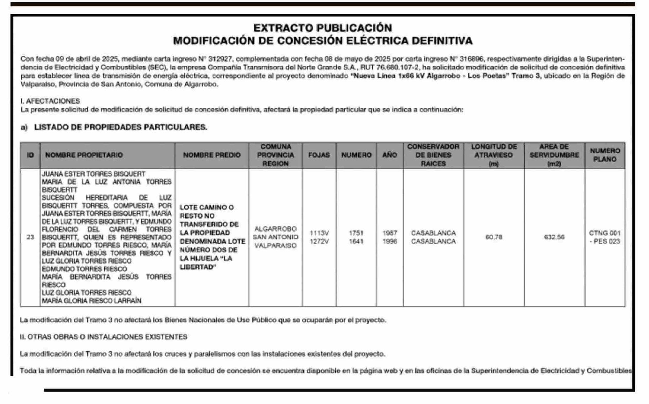Título: Extractos: EXTRACTO PUBLICACIÓN MODIFICACIÓN DE CONCESIÓN ELÉCTRICA DEFINITIVA Con fecha 09 de abril de 2025, mediante carta ingreso Nº 312927, complementada con fecha 08 de mayo de 2025 por carta ingreso N" 316896, respectivamente dirigidas a la Superinten- dencia de Electricidad y Combustibles (SE