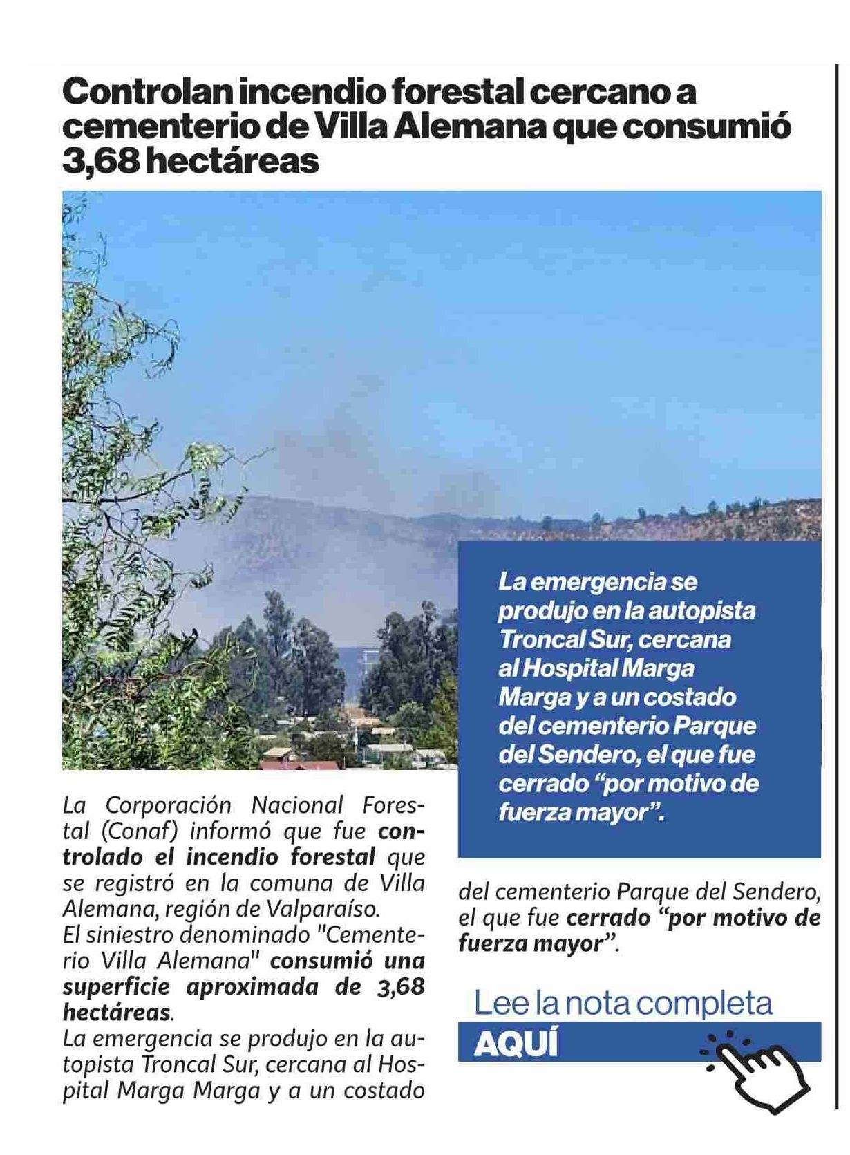 Controlan incendio forestal cercano a cementerio de Villa Alemana que consumió 3,68 hectáreas