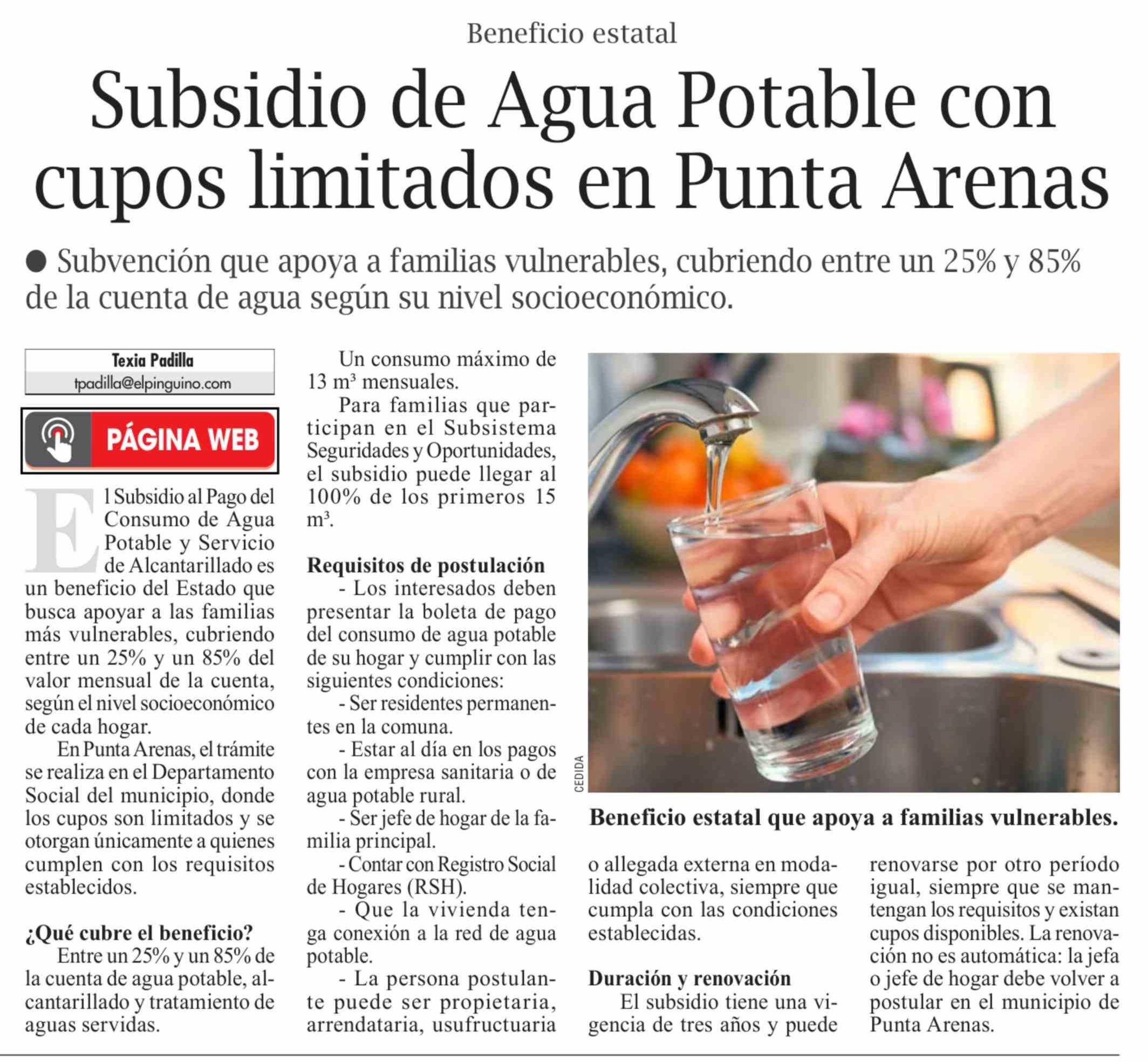 Subsidio de Agua Potable con cupos limitados en Punta Arenas
