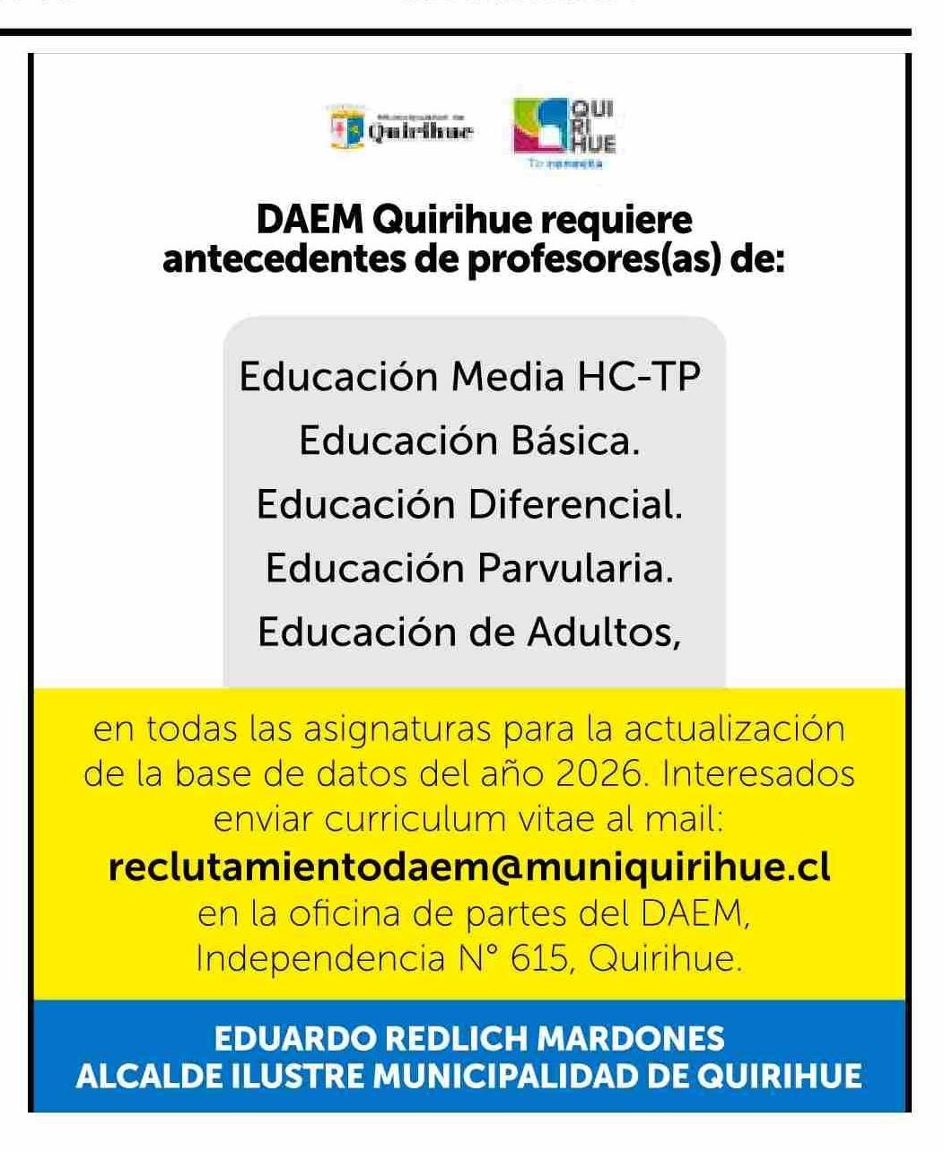 Extractos: DAEM Quirihue requiere antecedentes de profesores(as) de: