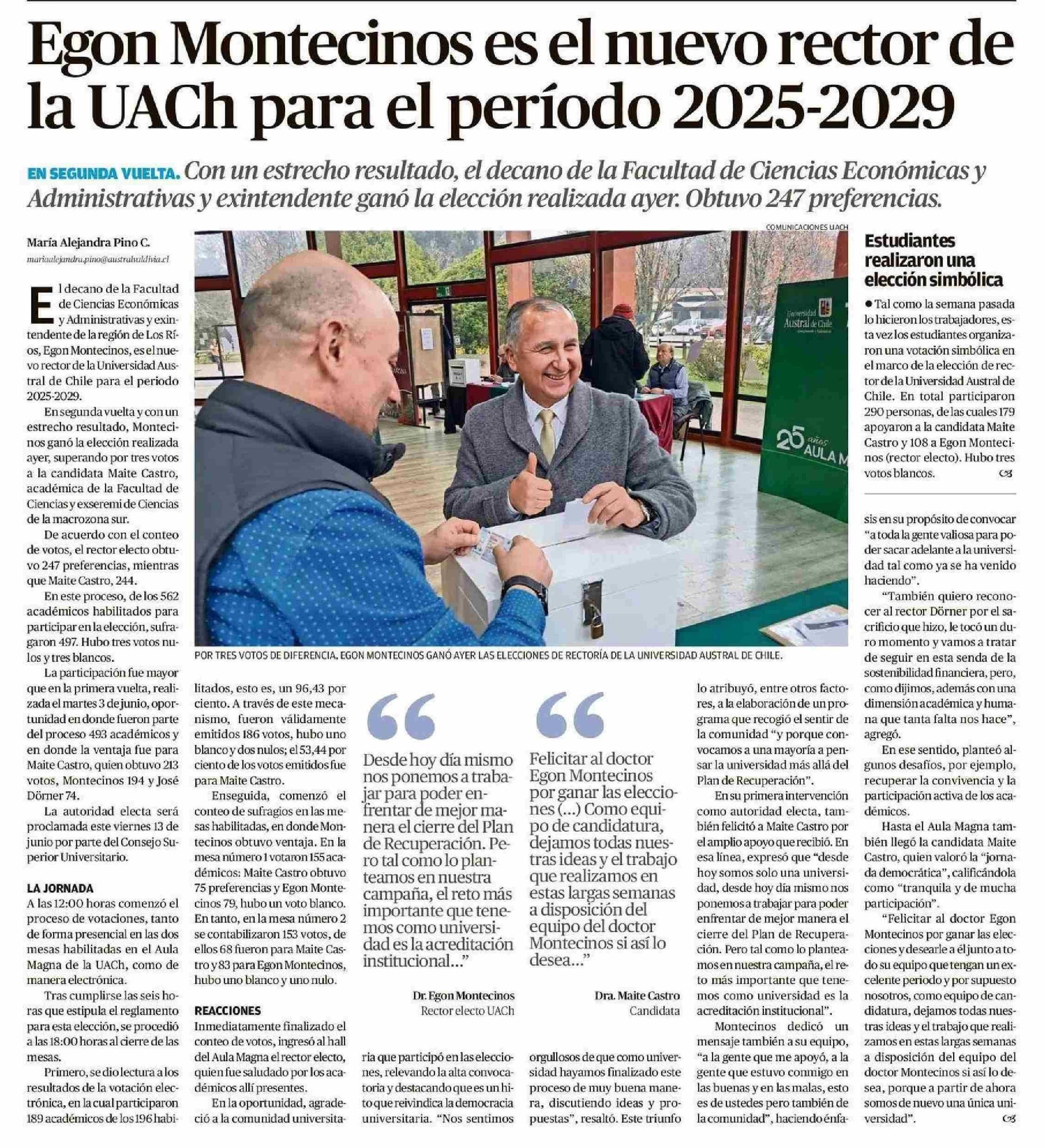 Egon Montecinos es el nuevo rector de la UACh para el período 2025-2029