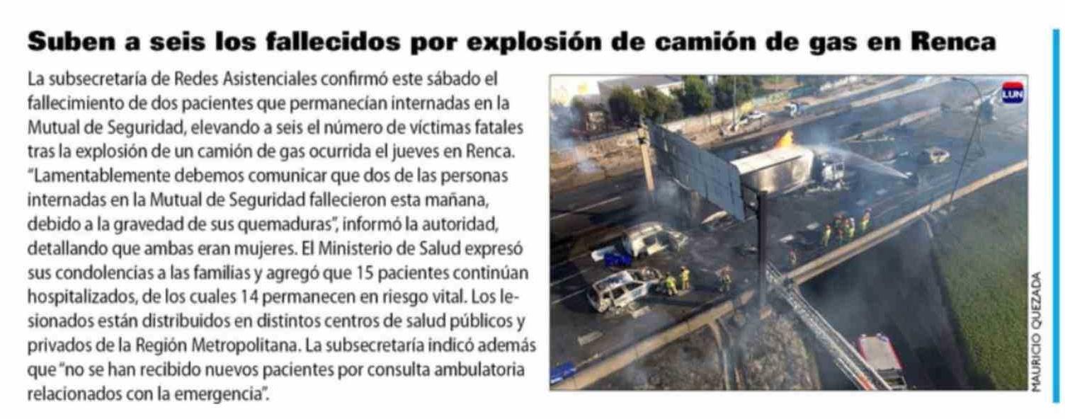 Suben a seis los fallecidos por explosión de camión de gas en Renca