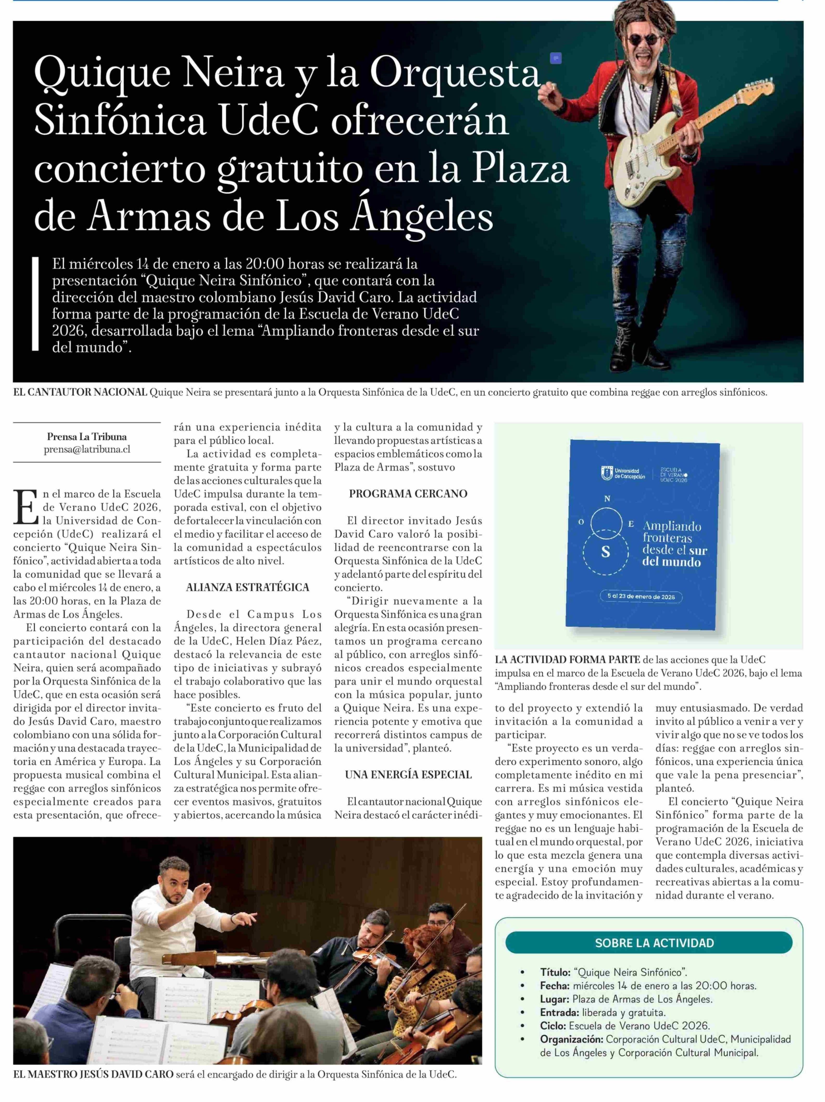 Quique Neira y la Orquesta. Sinfónica UdeC ofrecerán concierto gratuito en la Plaza de Armas de Los Angeles