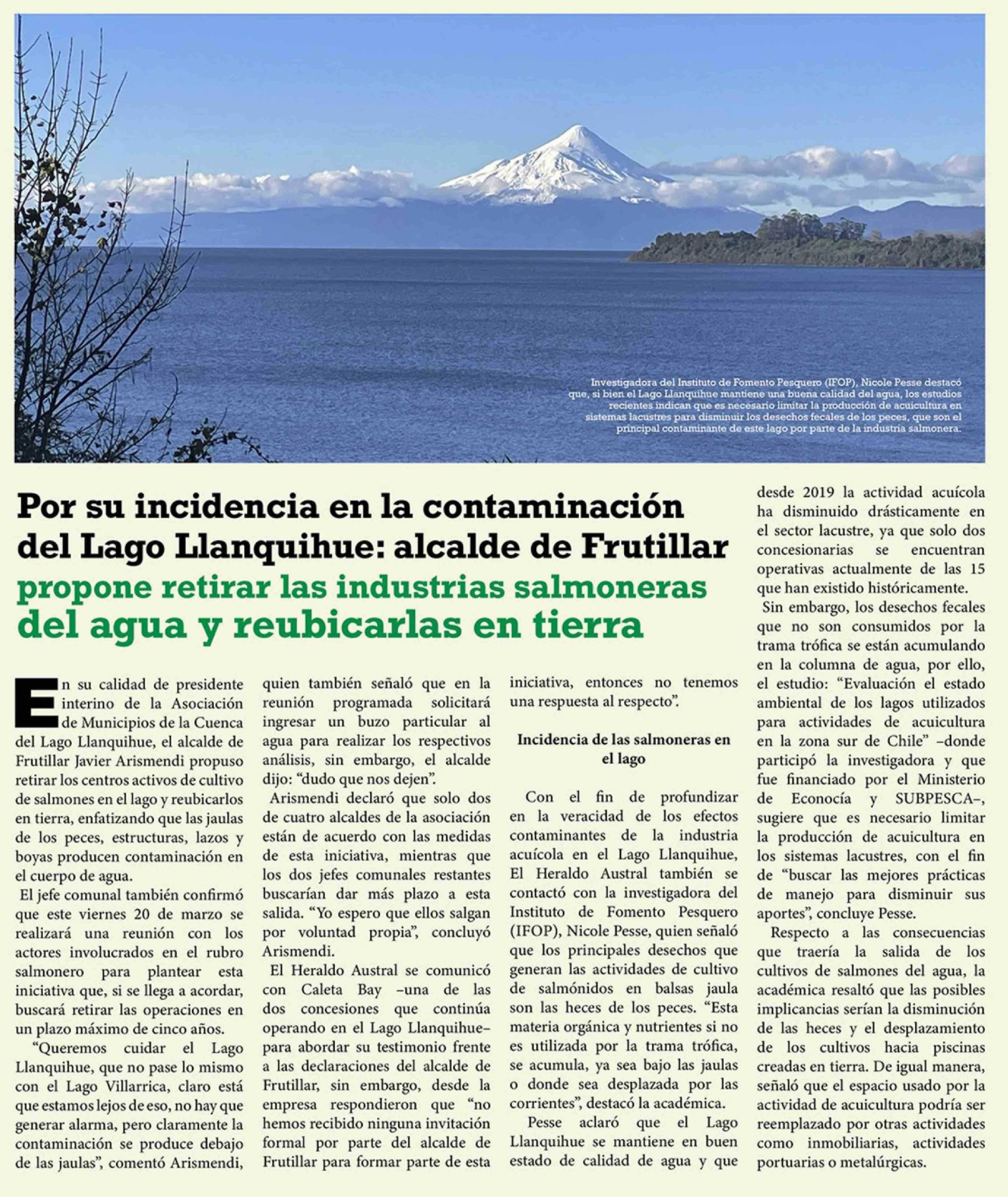 Título: Por su incidencia en la contaminación del Lago Llanquihue: alcalde de Frutillar propone retirar las industrias salmoneras del agua y reubicarlas en tierra