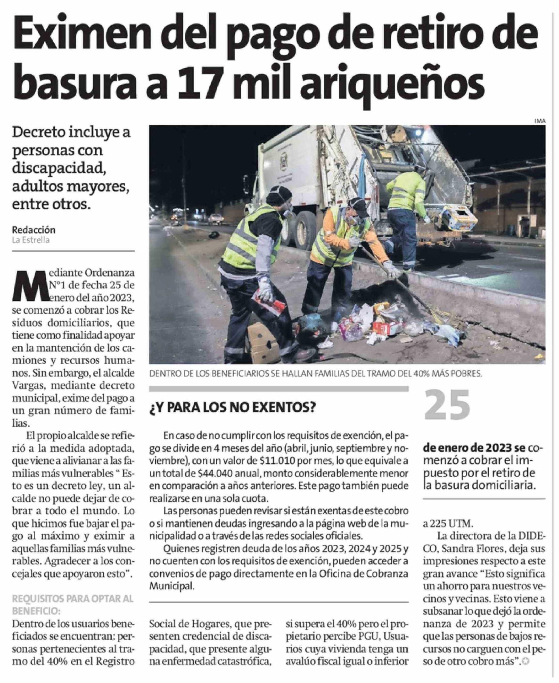 Eximen del pago de retiro de basura a 17 mil ariqueños