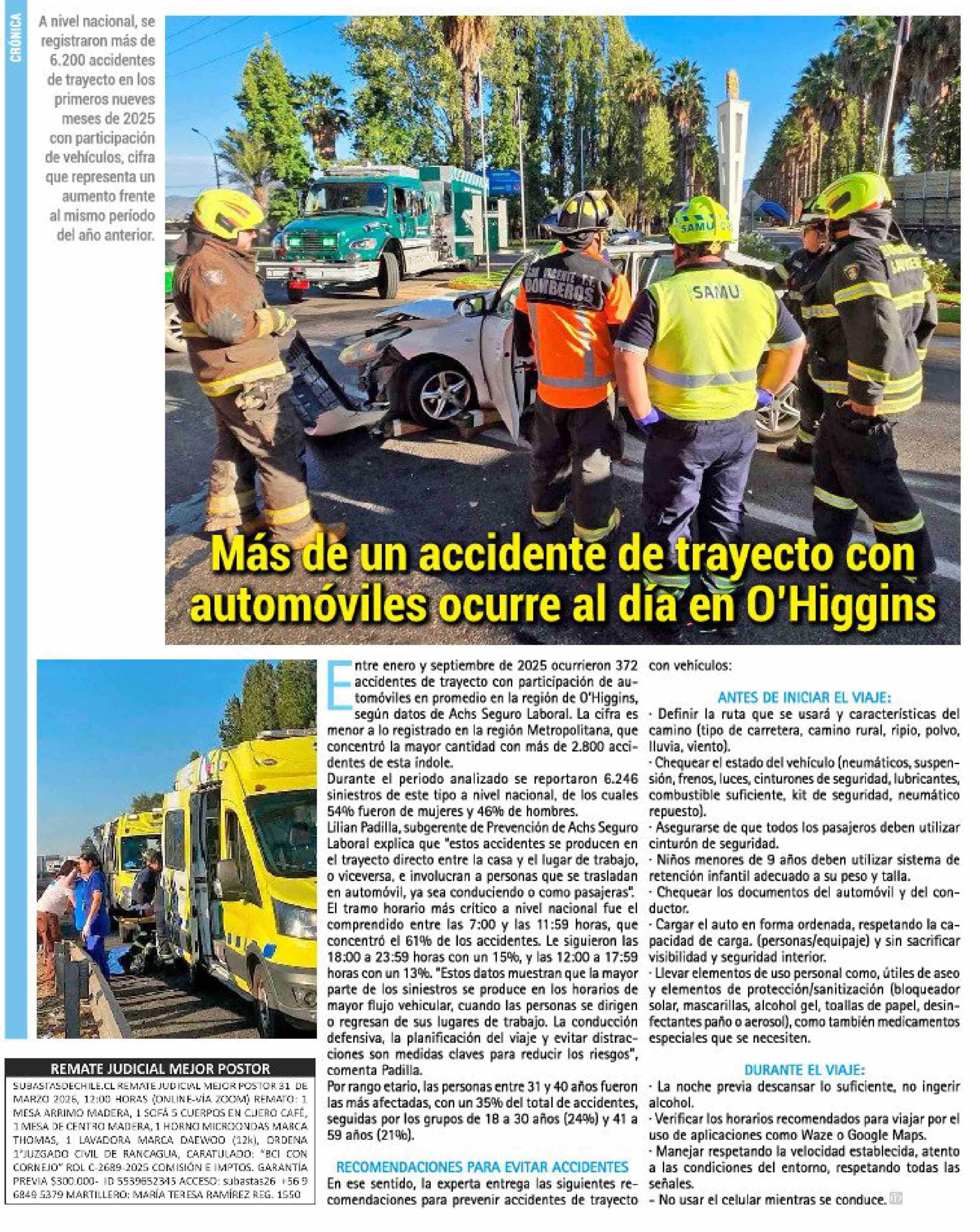 Más de un accidente de trayecto con automóviles ocurre al dia en O'Higgins