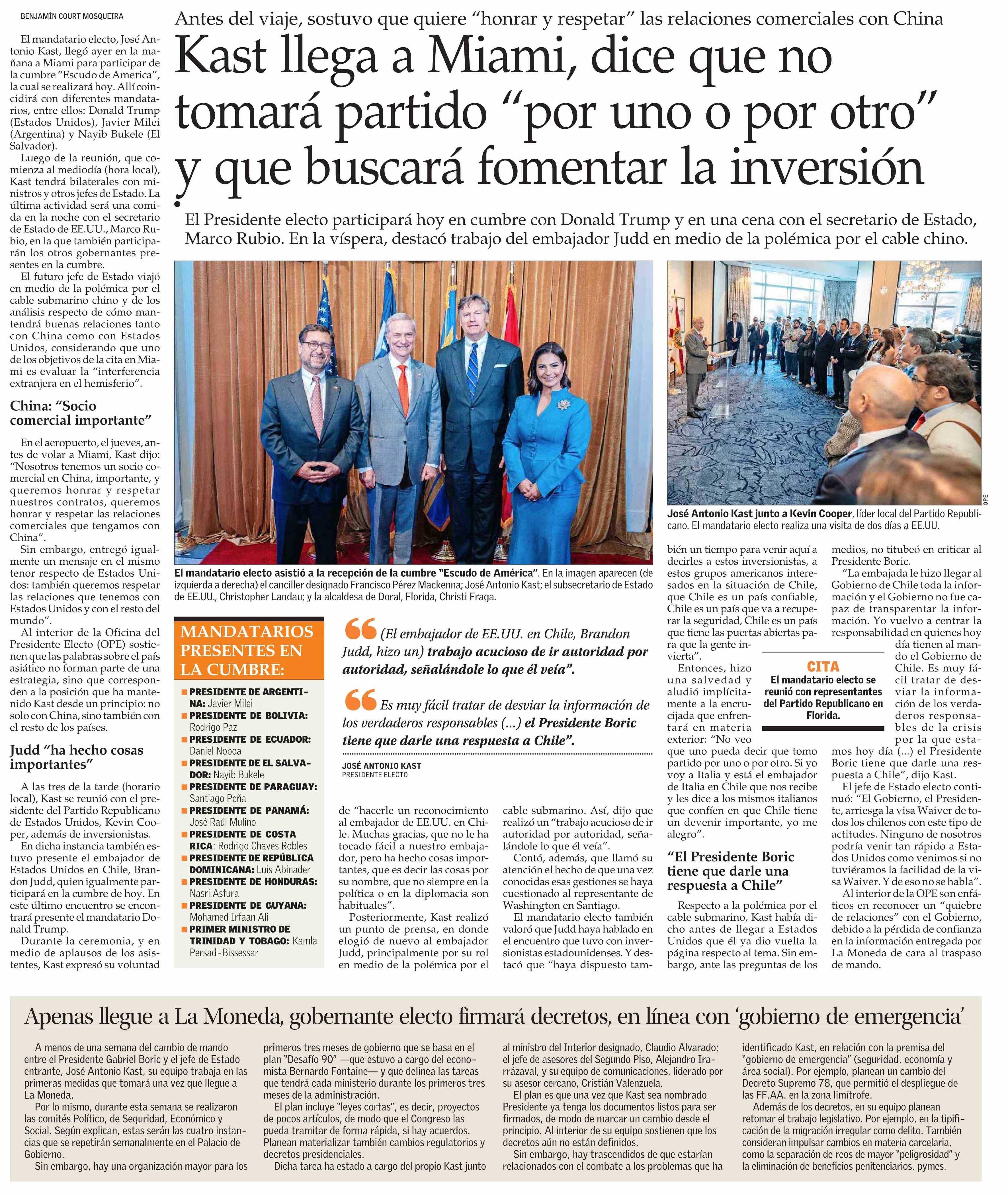Kast llega a Miami, dice que no tomará partido “por uno o por otro” y que buscará fomentar la inversión