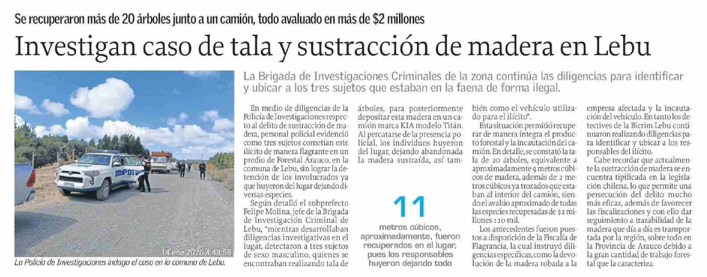 Investigan caso de tala y sustracción de madera en Lebu