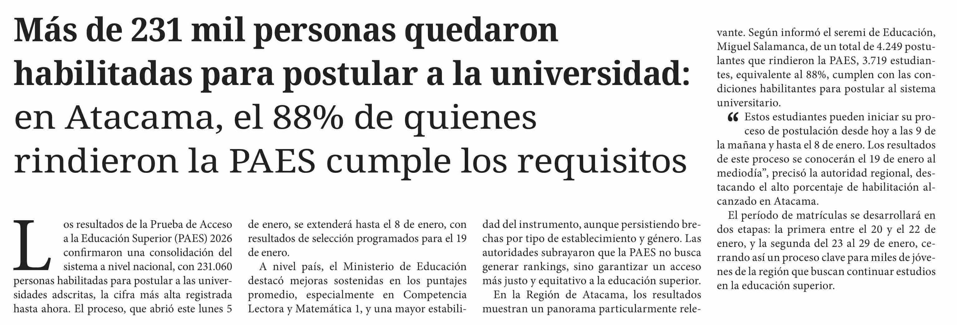Más de 231 mil personas quedaron habilitadas para postular a la universidad: en Atacama, el 88% de quienes rindieron la PAES cumple los requisitos