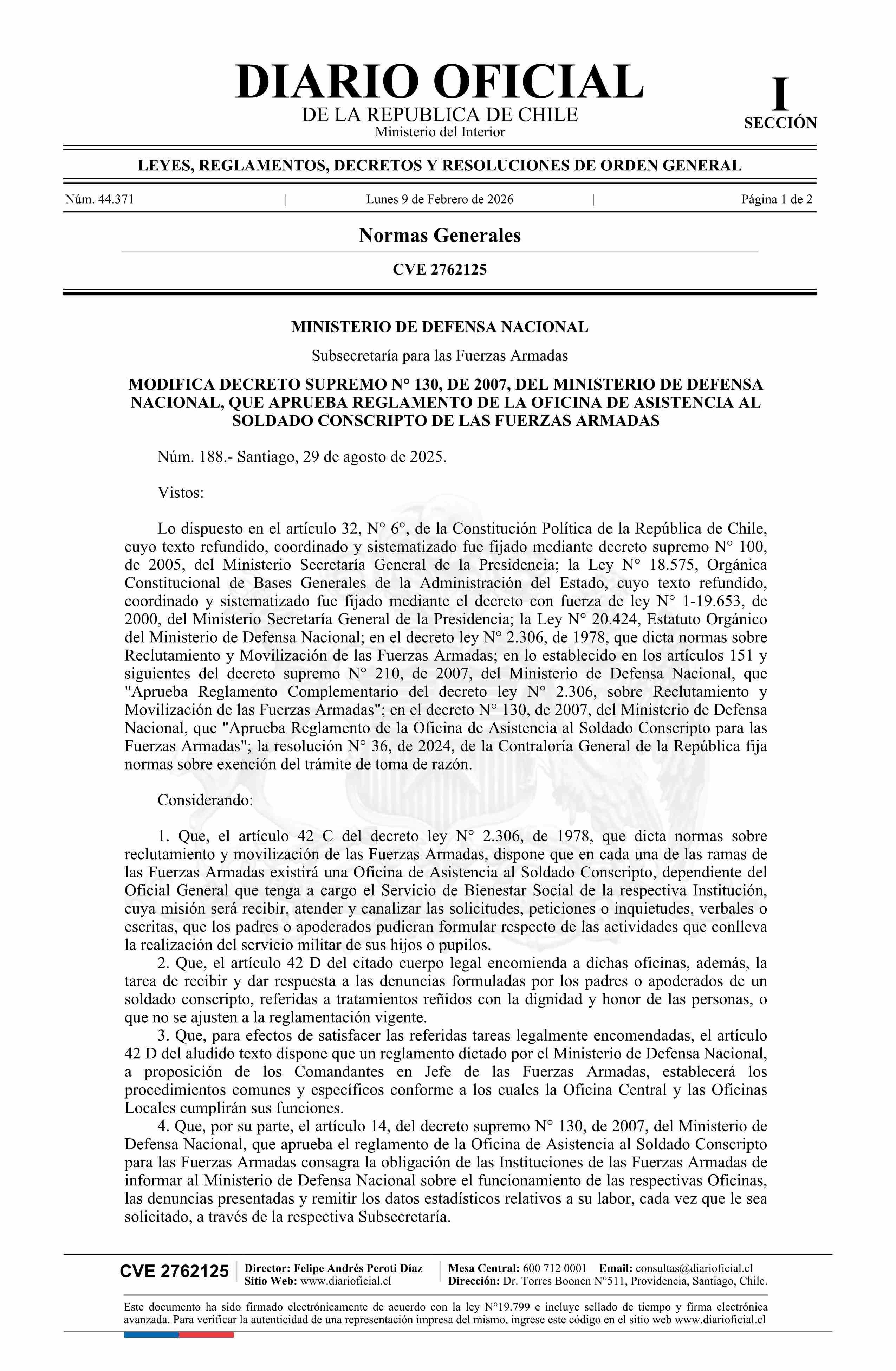 | Título: | Decreto número 188, de 2025.- Modifica decreto N° 130, de 2007, que aprueba Reglamento de la Oficina de Asistencia al Soldado Conscripto de las Fuerzas Armadas |