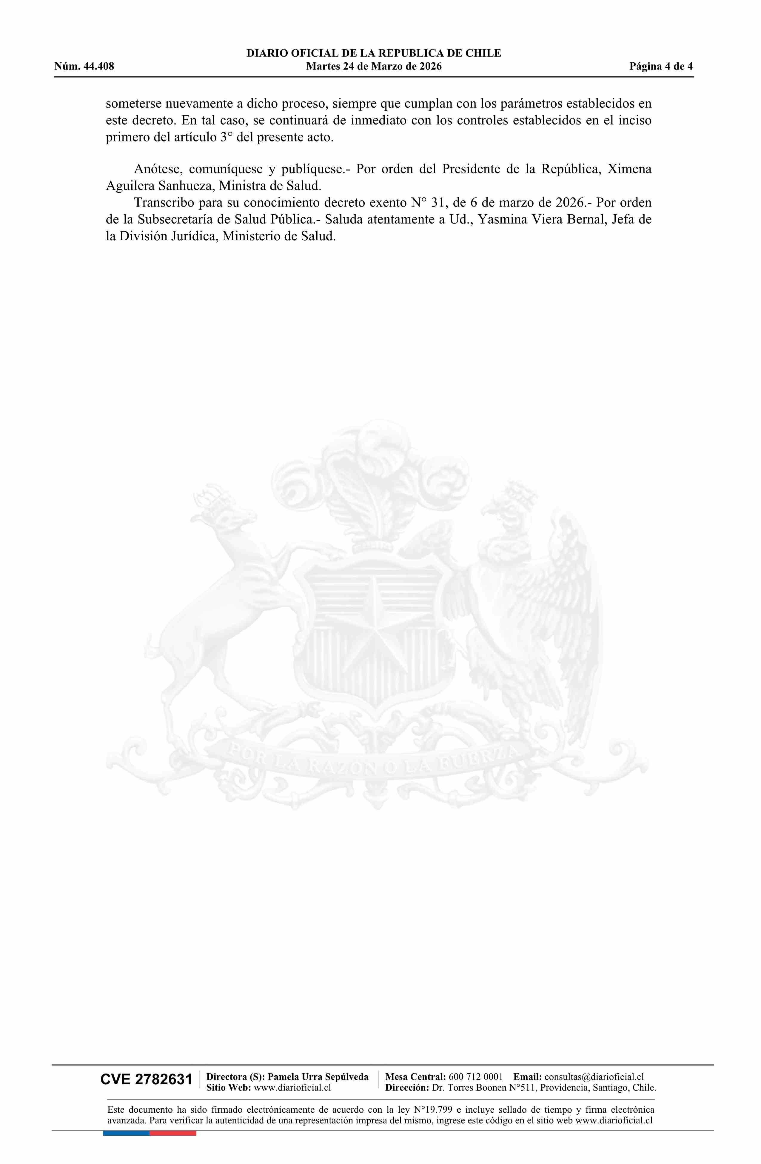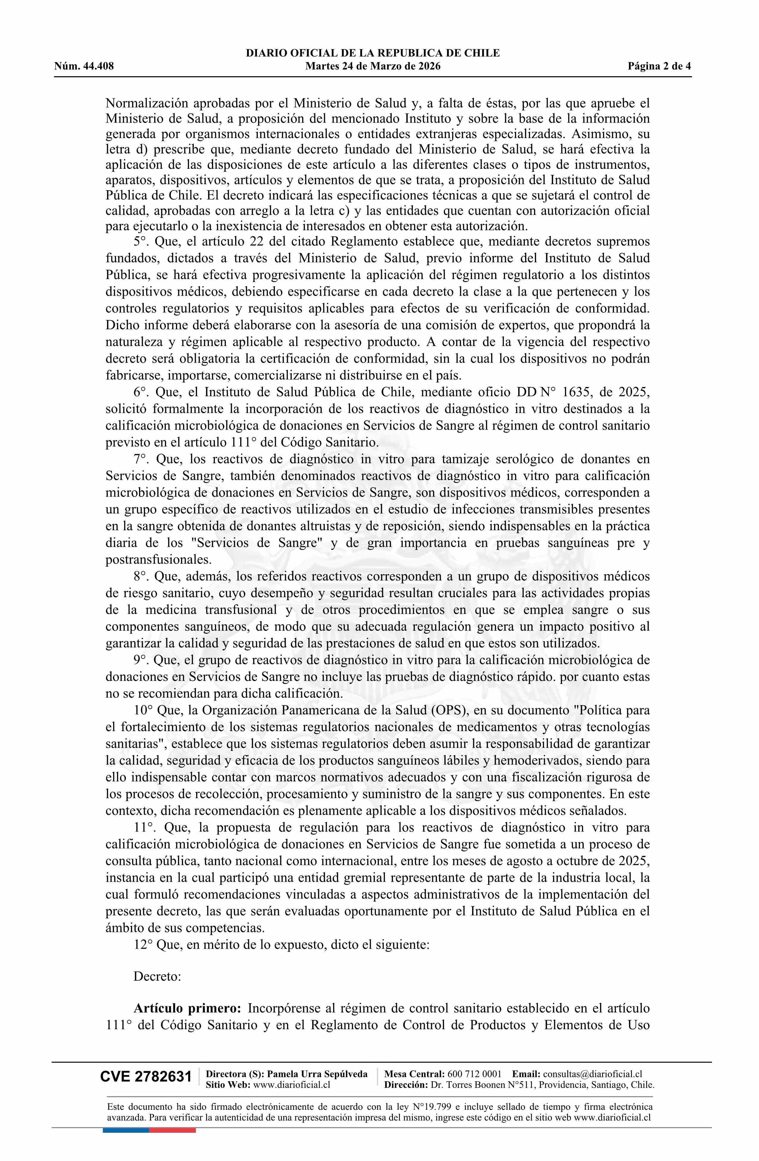 Título: Decreto exento número 31, de 2026.- Incorpora a los reactivos de diagnóstico in vitro para calificación microbiológica de donaciones en servicios de sangre, al régimen de control sanitario establecido en el artículo 111° del Código Sanitario
