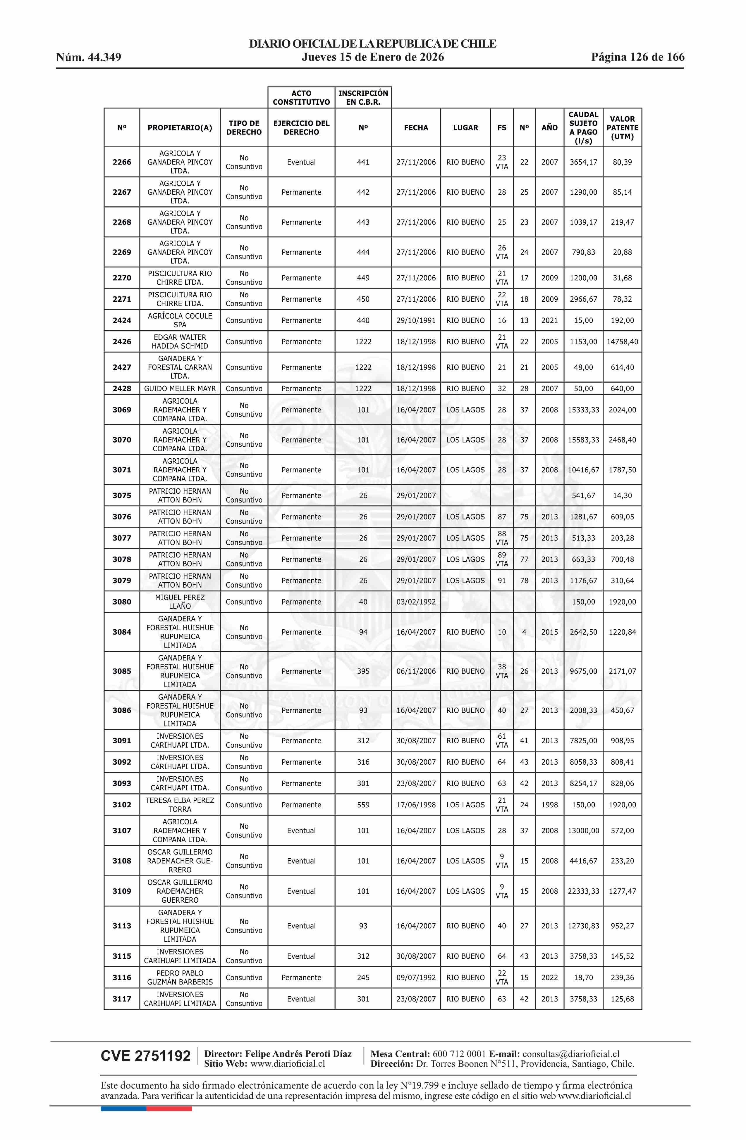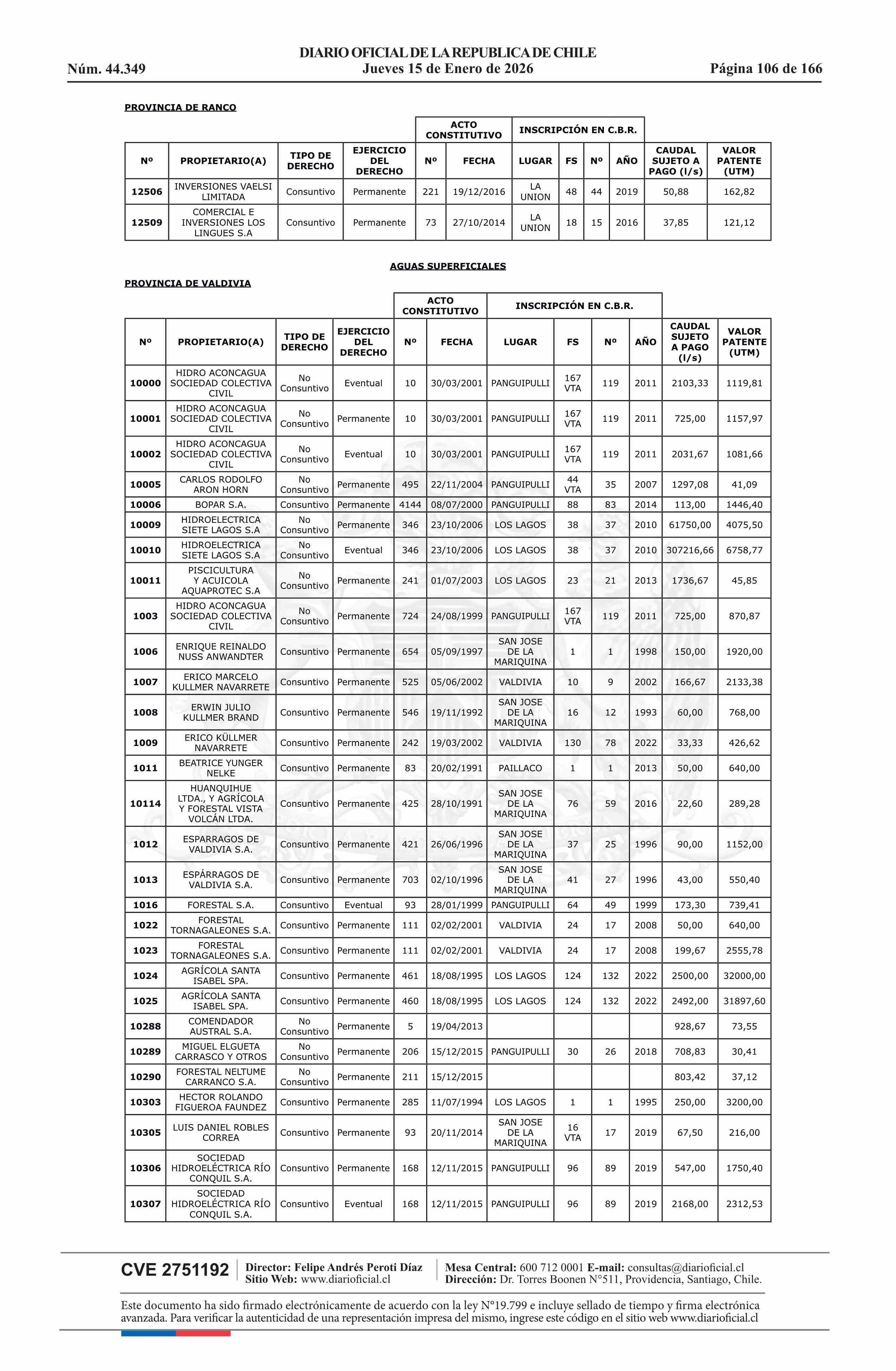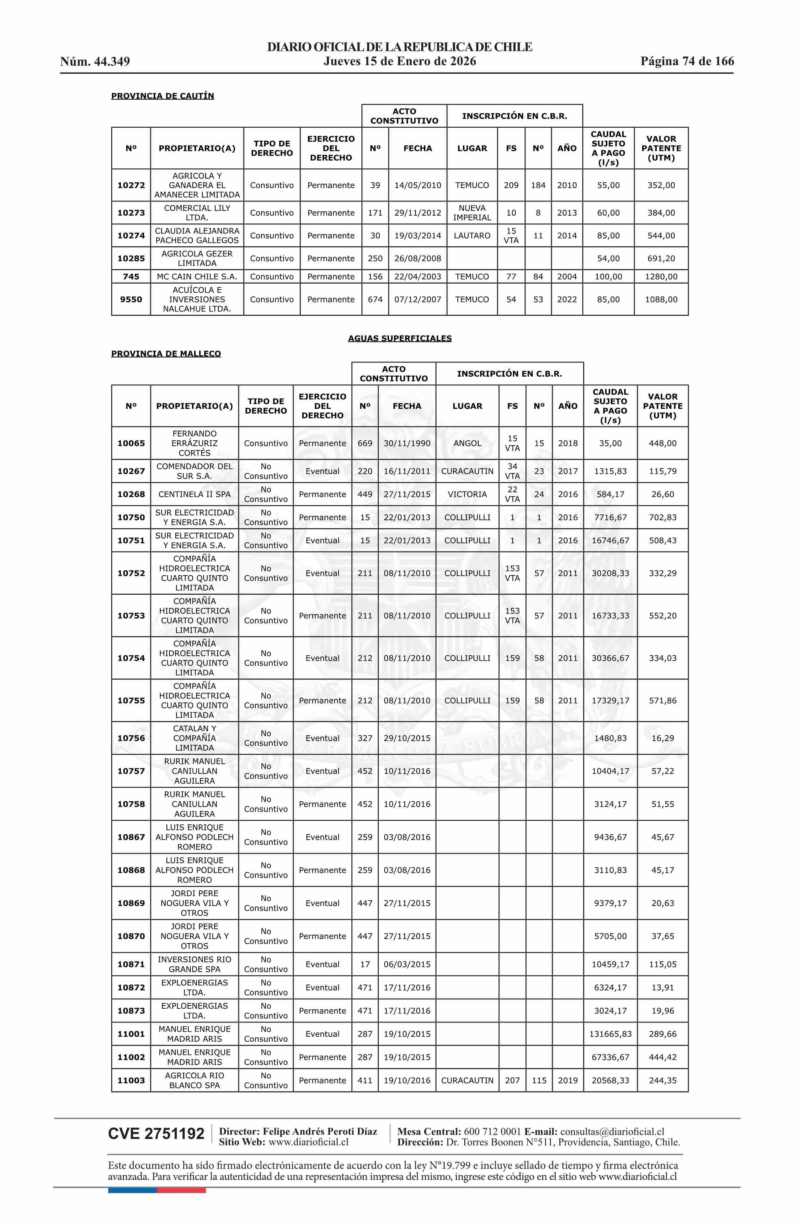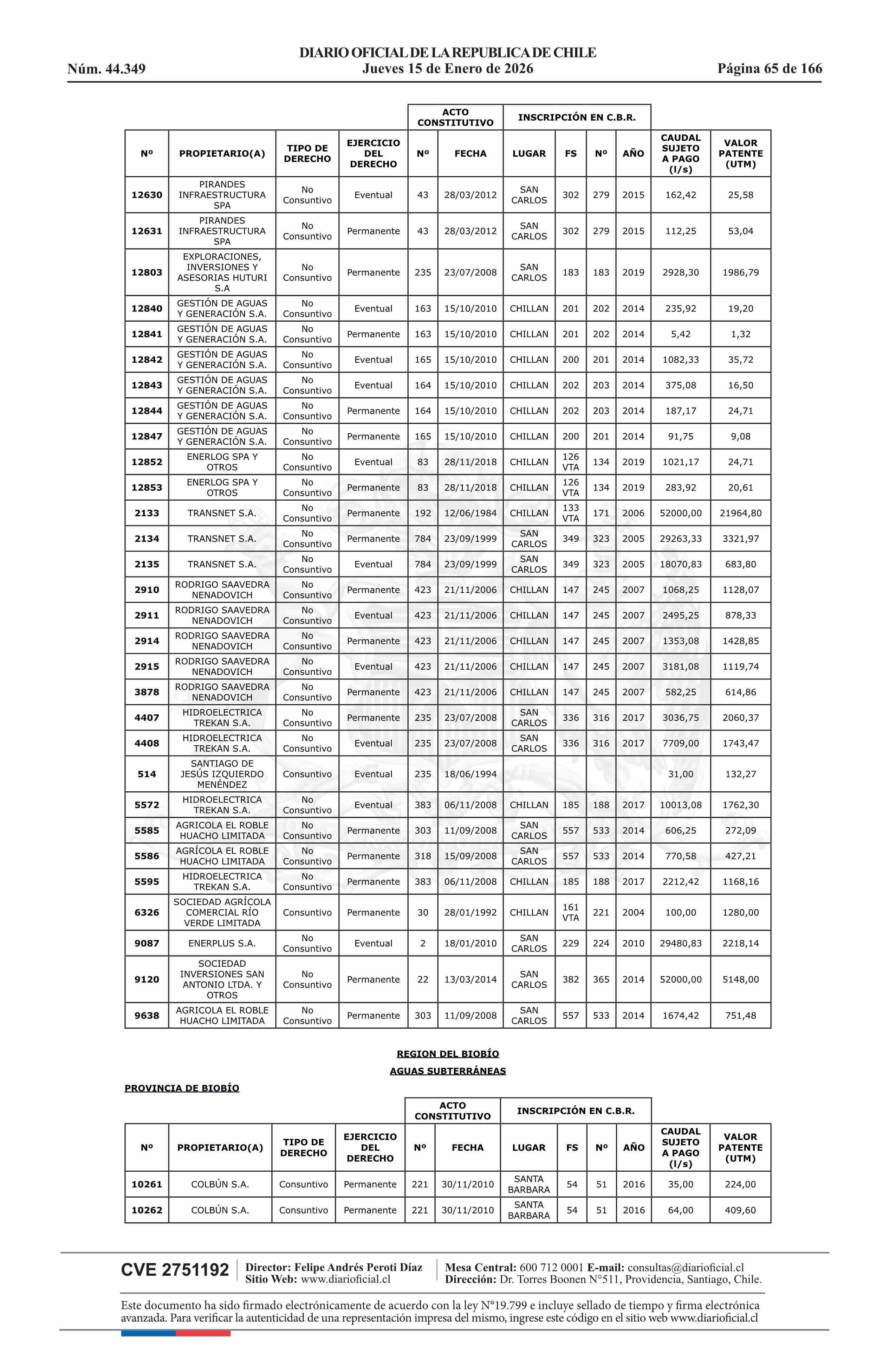 | Título: | Resolución exenta número 5.357, de 2025.- Fija listado de derechos de aprovechamiento de aguas afectos al pago de patente a beneficio fiscal por no utilización de las aguas, proceso 2026 |