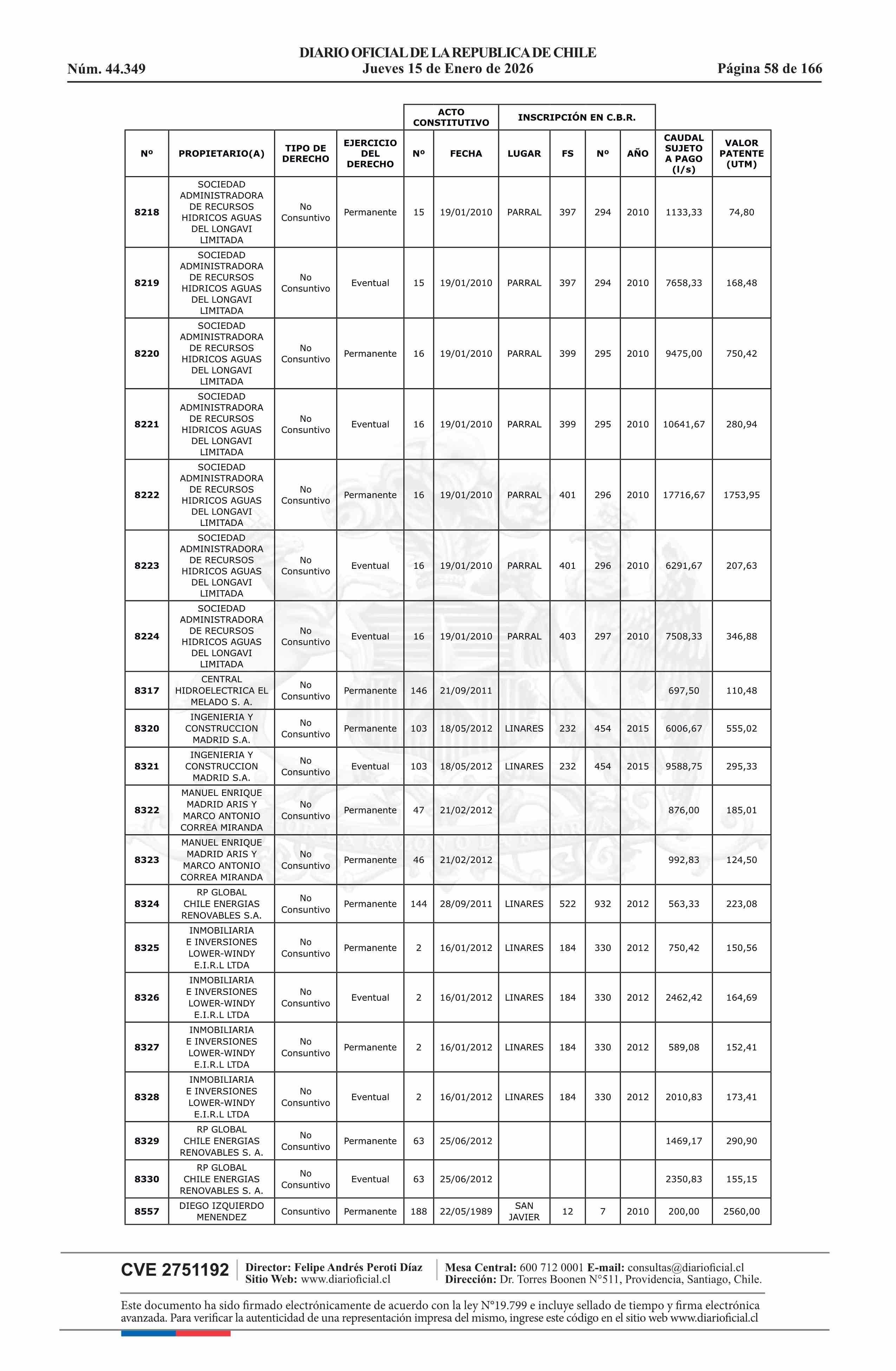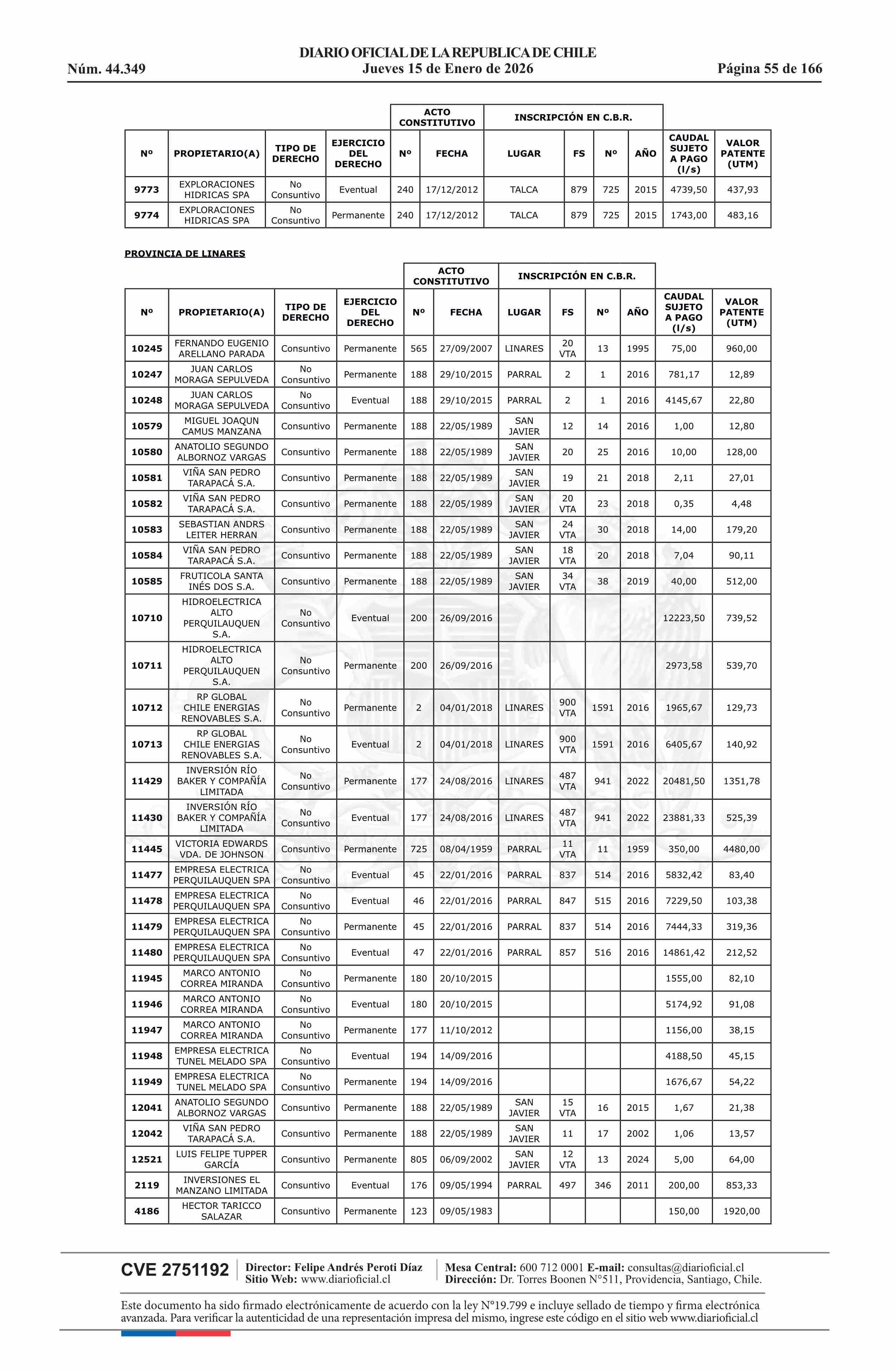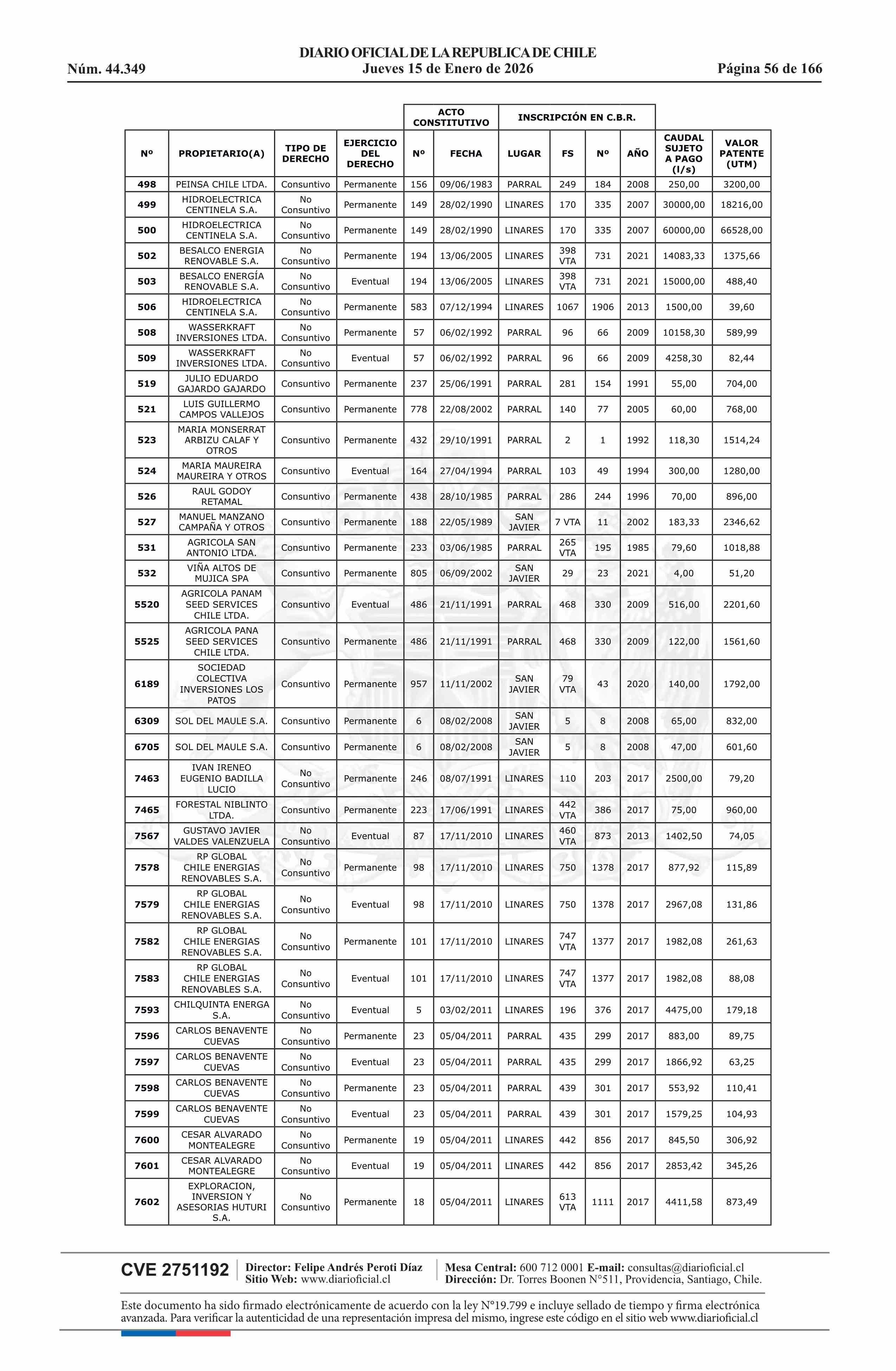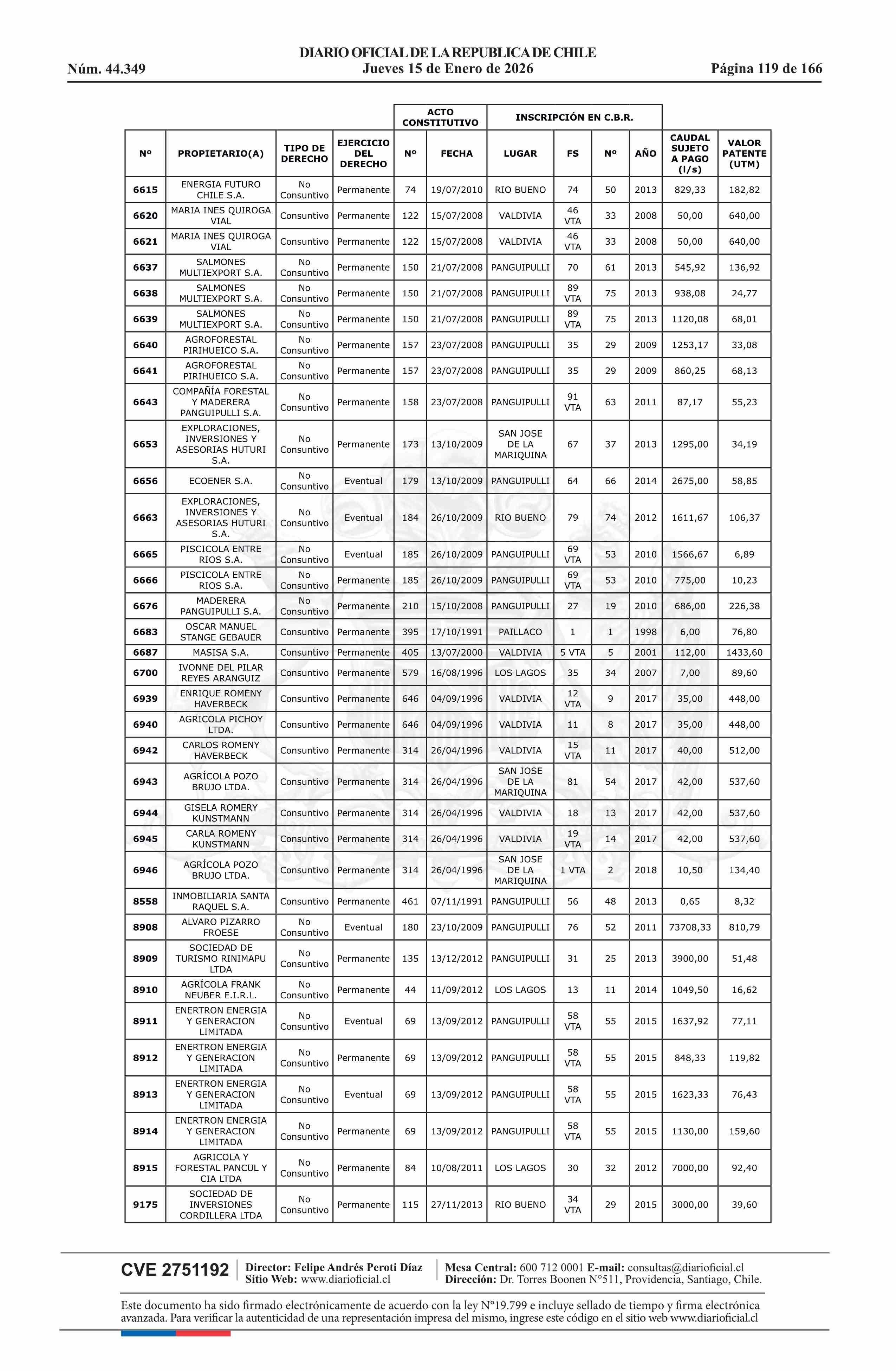 | Título: | Resolución exenta número 5.357, de 2025.- Fija listado de derechos de aprovechamiento de aguas afectos al pago de patente a beneficio fiscal por no utilización de las aguas, proceso 2026 |